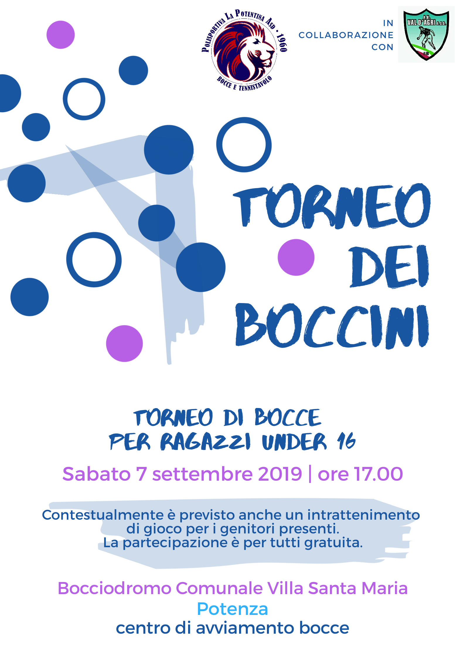 Sabato 7 settembre, nel bocciodromo di Villa Santa Maria, si terrà un mini torneo tra i “pulcini” delle bocce lucane: piccoli atleti in erba della bocciofila “Val d’Agri” e de “La Potentina” si sfideranno all’insegna delle regole di gioco, ma anche del divertimento. Contestualmente per mamme, papà e nonni che accompagneranno i giovanissimi sarà dedicato un intrattenimento boccistico, sempre a scopo di avvicinamento allo sport. Il “Torneo dei boccini” avrà inizio alle 17.00, con raduno alle 16.30, e la partecipazione è gratuita.