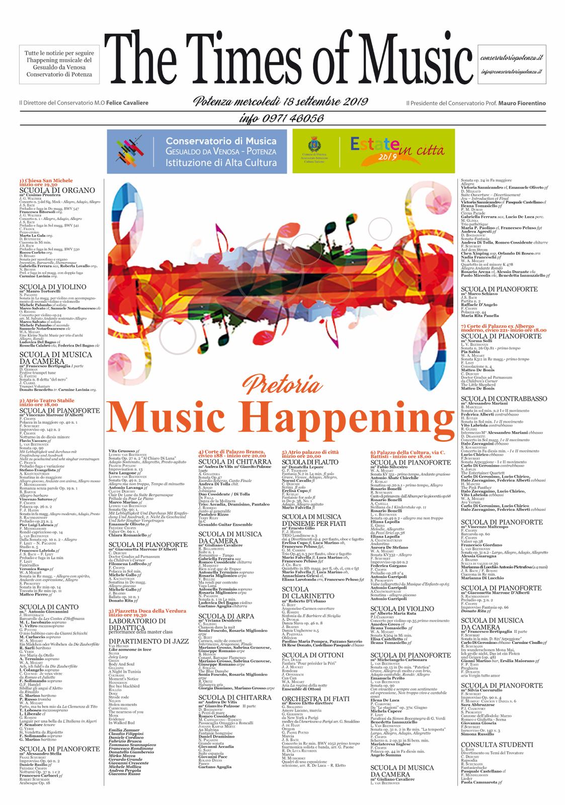 17 Settembre 2019 Pretoria music happening Percorso musicale nel centro storico della città di Potenza Mercoledì 18 settembre 2019, dalle ore 18:00 alle 23 Manifesto Download Comunicato stampaDownload