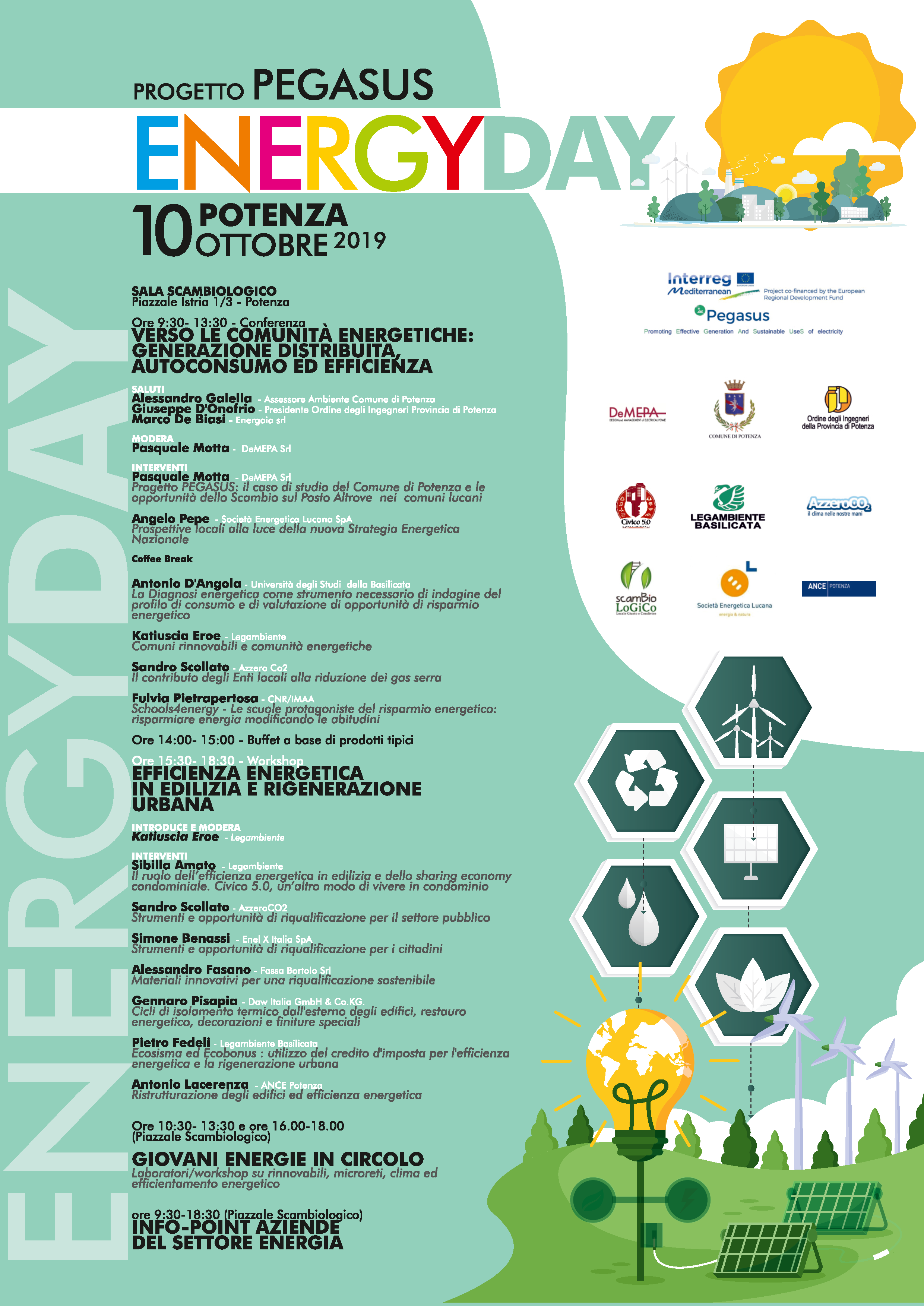 Un’intera giornata dedicata all’energia alla sua produzione e alla creazione delle comunità energetiche, con approfondimenti dedicati al mondo dell’edilizia sostenibile e della rigenerazione urbana. Organizzata dal Comune di Potenza in collaborazione con Legambiente Basilicata Onlus, l’evento racconta il Progetto Europeo Pegasus di cui il Comune è capofila, un progetto incentrato sulla la simulazione del funzionamentodi microreti energetiche in 7 aree pilota. Ma non solo nel corso della giornata si svolgeranno Workshop, dibattiti e laboratori aperti a tutti per ampliare conoscenza e consapevolezza su questi temi fondamentali.