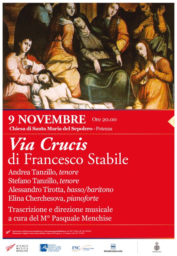 Sabato 9 novembre alle ore 20.00 la Chiesa di Santa Maria del Sepolcro di Potenza ospiterà un evento musicale di particolare importanza: l’esecuzione della Via Crucis di Francesco Stabile. L’opera del compositore lucano, trascritta e diretta dal m° Pasquale Menchise, fu rappresentata per la prima ed unica volta un anno prima della morte di Francesco Stabile proprio nel Convento di Santa Maria, dove Francesco Stabile fu Maestro di Cappella. L’Associazione Ateneo Musica Basilicata è lieta di invitare la cittadinanza a partecipare al concerto che vedrà protagonisti i tenori Andrea e Stefano Tanzillo, il basso/baritono Alessandro Tirotta accompagnati al pianoforte da Elina Cherchesova.