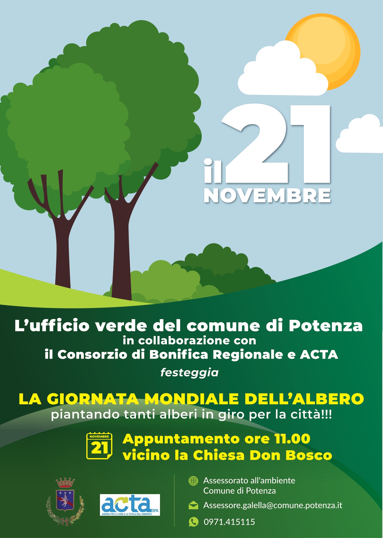 20 Novembre 2019 Giornata mondiale dell’albero Giovedì 21 novembre 2019, ore 11nei pressi della Chiesa ‘Don Bosco’ – Potenza ManifestoDownload Comunicato stampaDownload