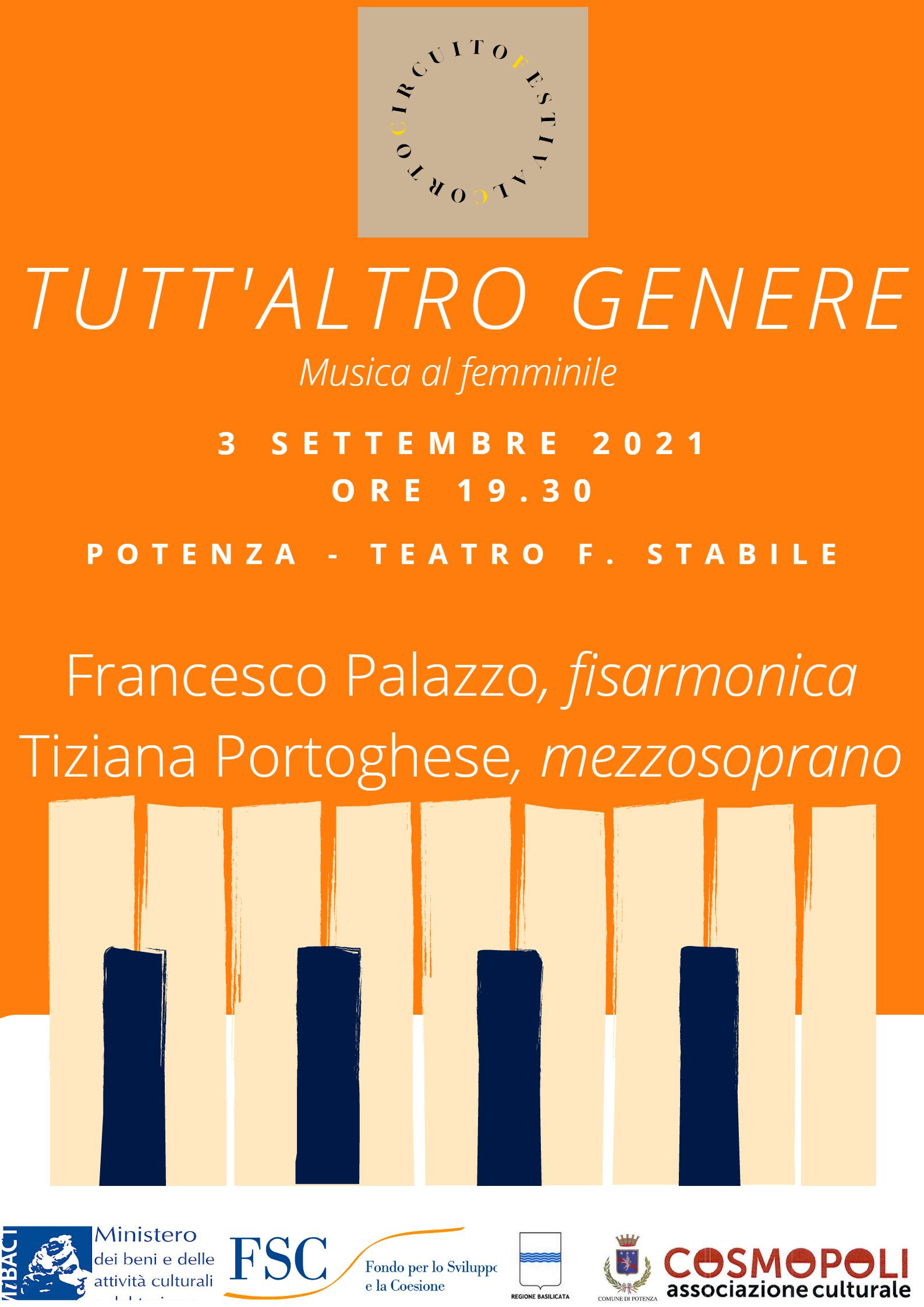 2 Settembre 2021 Corto circuito festival Tutt’altro genere. Musica al femminile3 settembre 2021, ore 19.30Teatro F. Stabile, piazza M. Pagano – Potenza LocandinaDownload