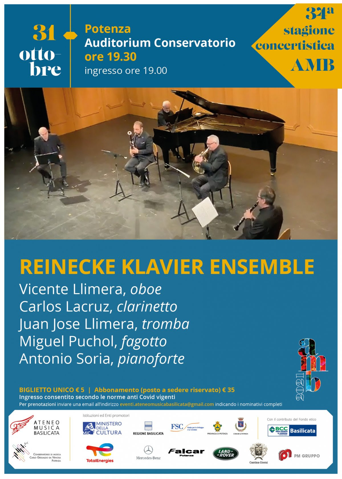 Reinecke Quintett, un ensemble di livello internazionale che viene dalla Spagna per proporre l’ascolto di due grandi classici capolavori per la loro formazione: il quintetto di Beethoven op. 16 per pianoforte e fiati e il quintetto di Mozart K452 per pianoforte e fiati. Un ensemble con una carriera internazionale alle spalle che si è esibito nei più i più importanti teatri del mondo.
