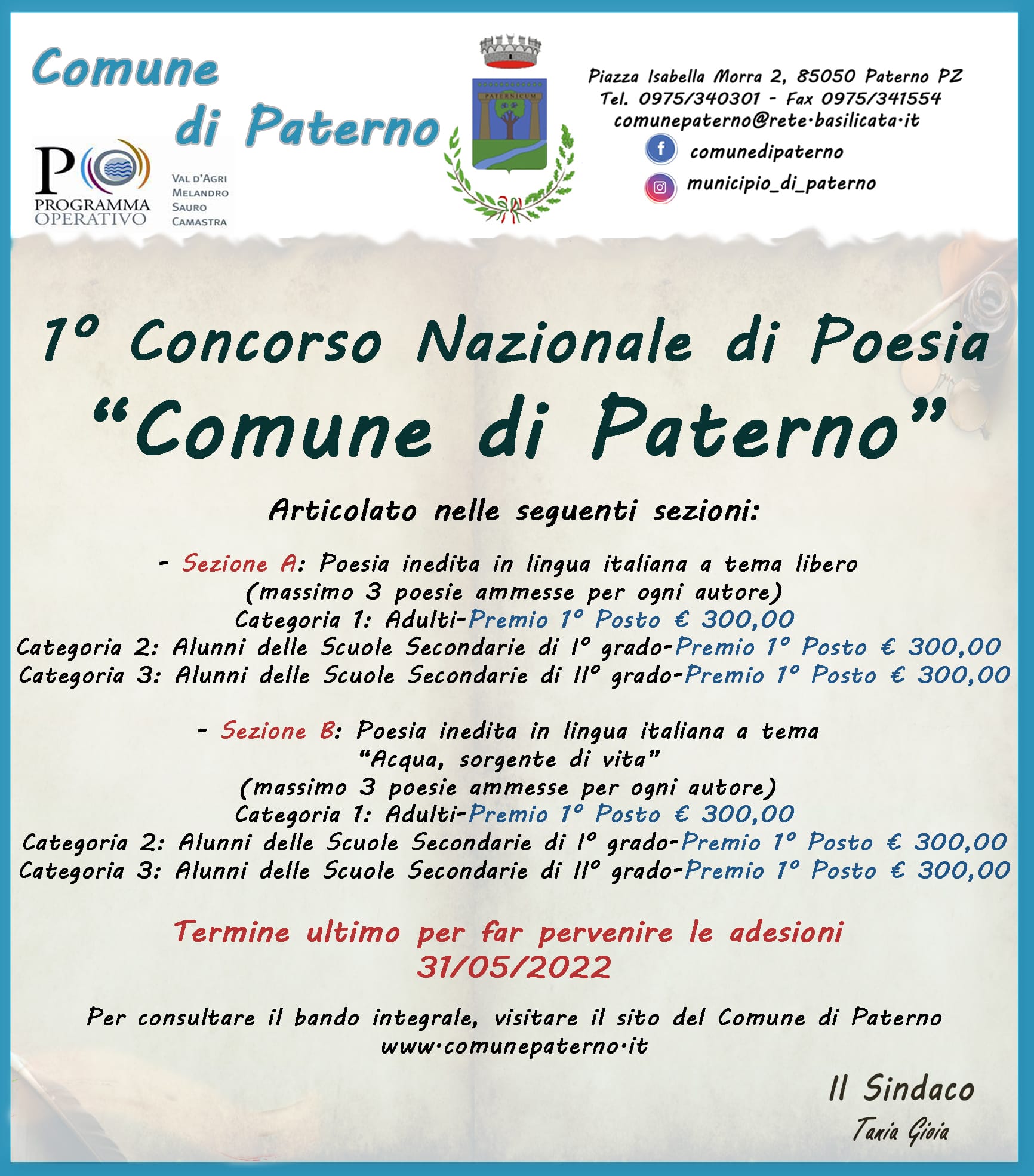 Il comune di Paterno, indice e bandisce la Prima edizione del ‘Concorso nazionale di poesia del Comune di Paterno’ per l’anno 2022.