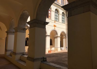 Il monastero di San Luca fu eretto all’estremità del pianoro che ospita il centro cittadino, nei pressi del già Castello, poi ospedale, per accogliere le suore di osservanza benedettina provenienti dall’ex monastero di San Lazzaro, già presente in città all’inizio del XIII secolo e scomparso con la peste del 1413.