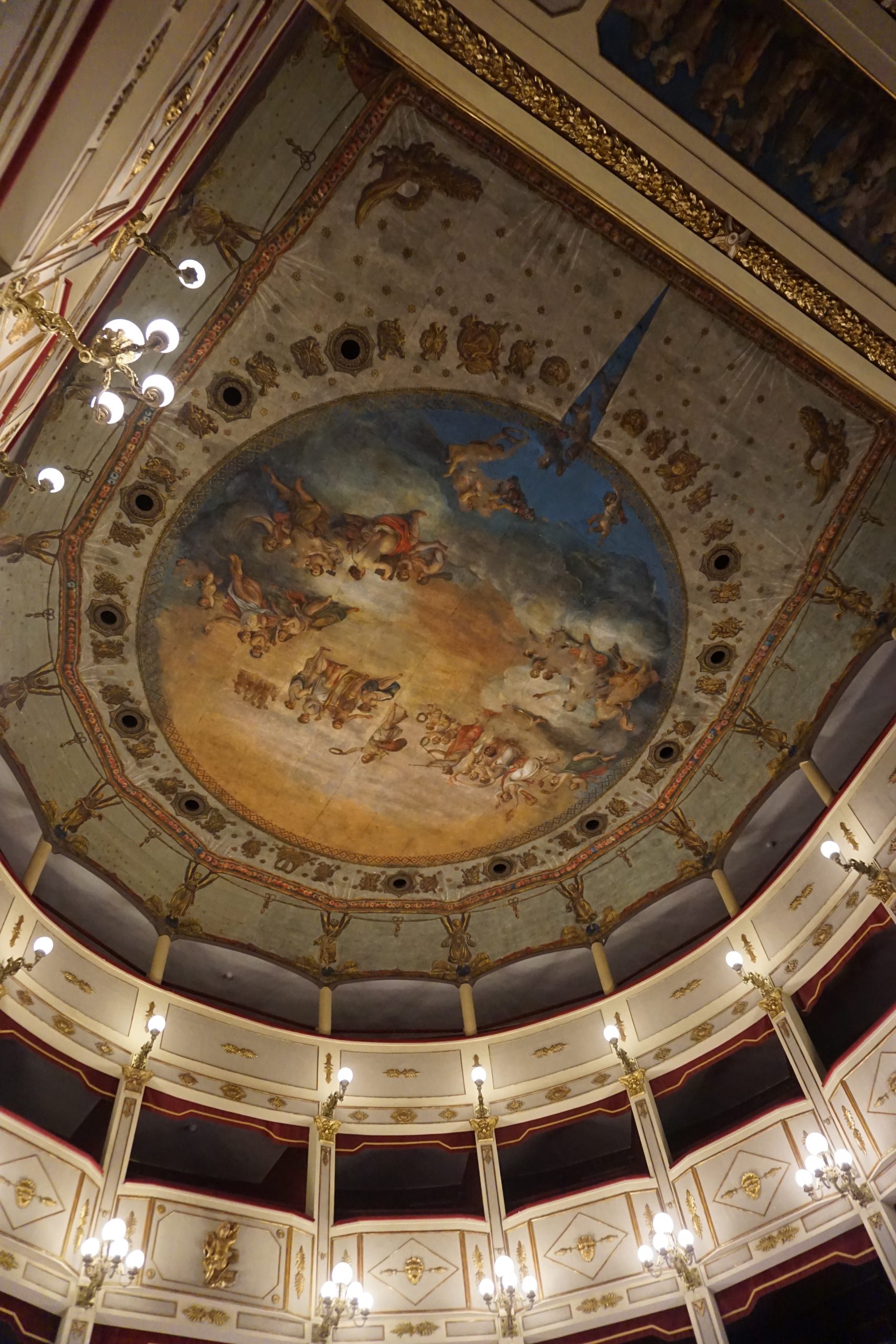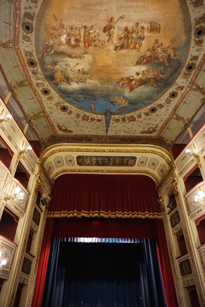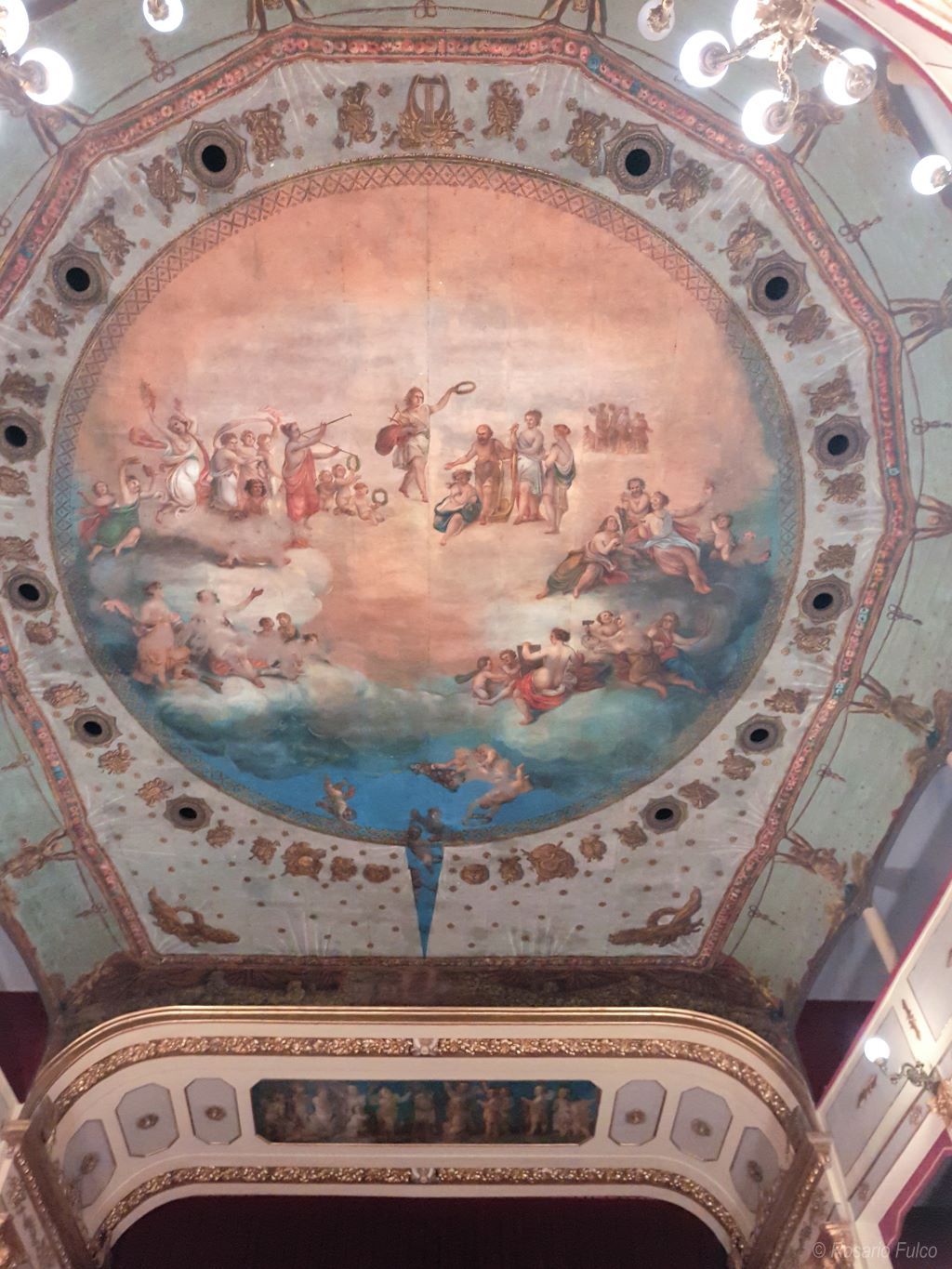 Al pittore Luigi De Luise è attribuito il plafond che domina la sala dello spettacolo, dove è raffigurata l’Apoteosi Di Pitagora. Il soggetto dell’opera fu progettato da Vincenzo Marinelli (San Martino d’Agri)prestigioso artista della pittura italiana del 1800, il quale, attingendo “ nel tesoro delle grandezze lucane ”, proietta la sua ricerca nell’epoca della Magna Grecia, con particolare riferimento alle scuole pitagorica ed eleatica…..