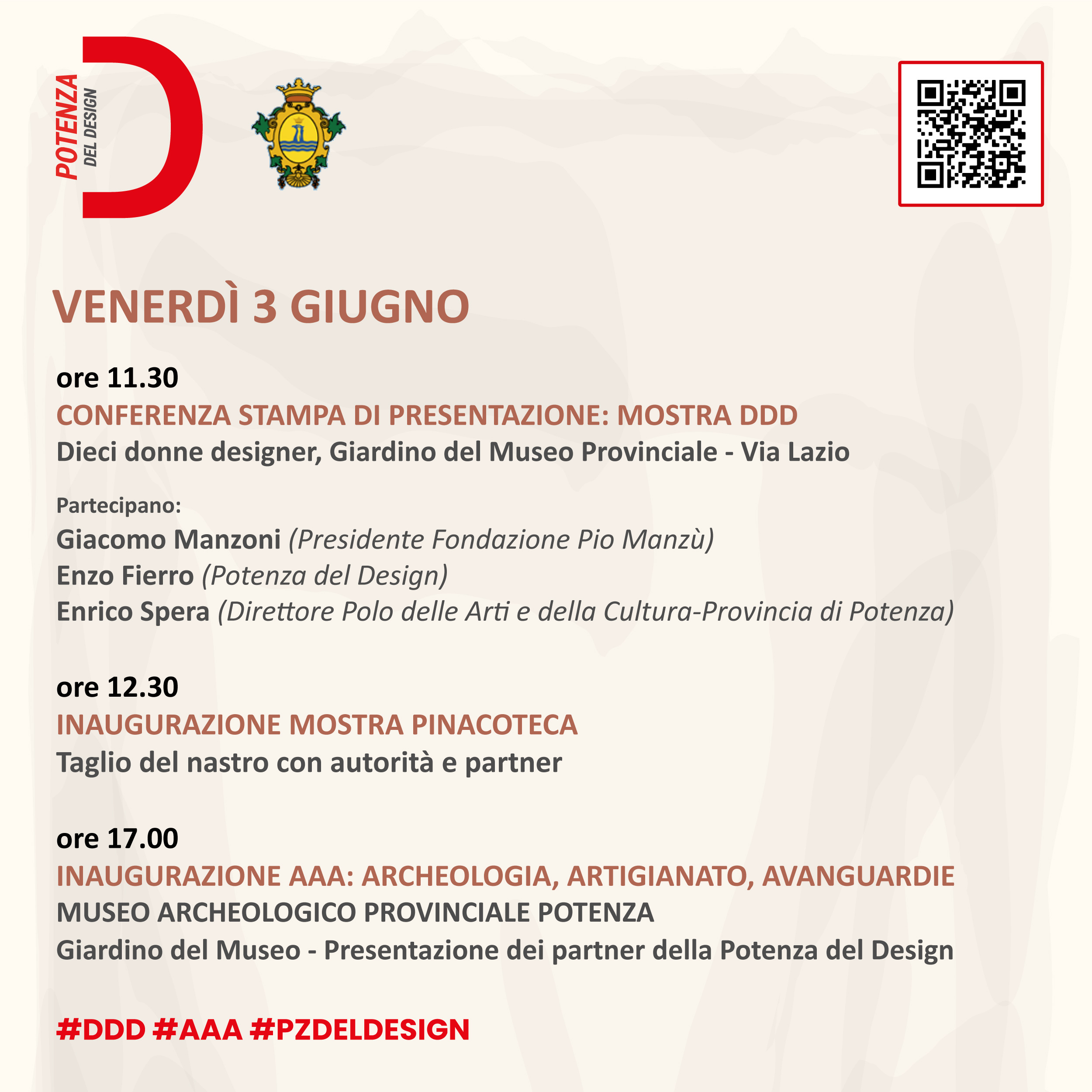 Nella Pinacoteca sarà possibile visitare l’esposizione DDD “Dieci donne designer” iniziativa della Fondazione Pio Manzù, che ha fortemente voluto Potenza tra le 5 tappe del tour nazionale iniziato a Varenna, Città internazionale del Design. Dieci designers italiane Eleonora Castagnetta Botta, Agustina Bottoni, Virginia Cei, Natalia Criado, Astrid Luglio, Stella Orlandino, Caterina Licitra Ponti, Margherita Sala, Marta Sansoni e Ilenia Viscardi collocheranno i propri progetti realizzati e riconoscibili all’interno della Pinacoteca prevedendo inoltre un progetto di allestimento che faccia da trait-d’union, così da creare dei rimandi visivi e formali capaci di mutare la percezione che l’osservatore ha dello spazio circostante, mettendo in luce i legami sottesi e inattesi tra il luogo e l’oggetto esposto.