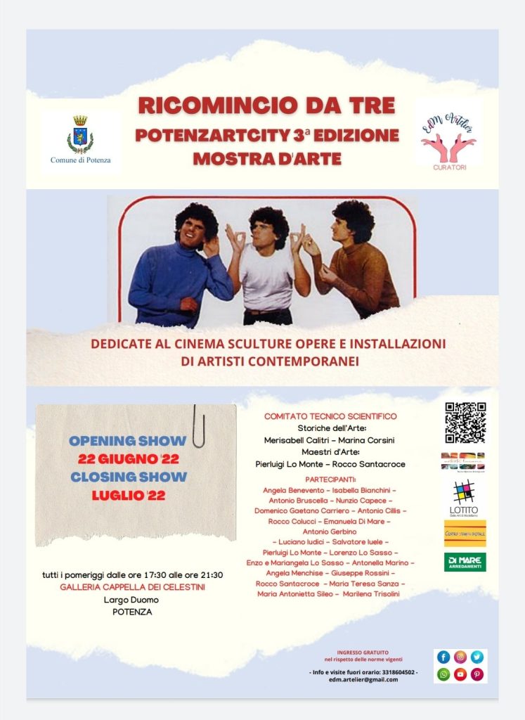 21.6.2022 – ore 9,35: Il 22 giugno 2022 alle ore 18, nella Cappella dei Celestini, in Largo Duomo a Potenza, prenderà il via la terza edizione di PotenzArtCity, che quest’anno ha scelto il titolo ‘Ricomincio da tre’. L’organizzatrice dell’esposizione, Emanuela Di Mare, ha espresso la propria riconoscenza per “il patrocino offerto dal Comune di Potenza, grazie all’interessamento del sindaco Mario Guarente, della sua equipe organizzativa e, soprattutto, grazie alla solerte ed efficace presenza dell’assessore alla Cultura e al Turismo, Stefania D’Ottavio che, sinergicamente, impreziosiscono tutti gli intenti degli artisti e degli organizzatori. L’iniziativa va a contribuire, insieme a tante altre realtà, allo sviluppo del nostro territorio lucano e nazionale”. “Una fortunata collaborazione che prosegue – sottolinea l’assessore D’Ottavio – quella con la Di Mare, artista eclettica, che riesce a unire in sé le capacità espressive a quelle di autentica mecenate, in grado di mettere in rete il mondo dell’arte locale, e non solo locale, favorendo l’incontro con il pubblico di quello che è un vero e proprio tesoro. Una diffusione per così dire ‘diretta’, tra opere d’arte, chi le produce e chi ha la possibilità di visionarle, che assegna al Comune il compito di portare a sistema questa esperienza, facendo sì che viva nei propri contenitori culturali, utilizzati e valorizzati nel ruolo che è loro più proprio, quello di palcoscenico di qualità a servizio della comunità cittadina”. Gli organizzatori dell’evento evidenziano, dal canto loro, come “la vita possa essere paragonata a un film o a una rappresentazione teatrale. O ancora a una buona poesia o a un lungo libro che racconta tutte le stagioni, meglio ancora una canzone azzeccata o un brano musicale che ne rappresenti il giusto sottofondo, brutta o bella che sia stata la storia vissuta. La vita, come al cinema, è ricca di spezzoni che vanno osservati, conservati o cestinati, ma se rispuntano tra i ricordi varrà bene il tentativo di ricomporre tutto. Un mosaico di pezzettini di cuori forti, tenaci da riavvicinare per ‘ricominciare’. L’insegnamento di Massimo Troisi col suo film a tema ‘ricomincio da tre’, nel quale, da protagonista, insieme tanto e tutto, ci riconduce alla positività necessaria per abbattere i muri del momento. Abbiamo percorso tutti terreni instabili e cieli impetuosi, ma non é stato mai, mai, mai un totale disastro. Se almeno tre successi o più sono validi e trionfanti, non strappiamo il meglio che é stato e ripartiamo daccapo dal buono che c’è in ognuno di noi. La storia continua, come in un bel film senza fine!”.