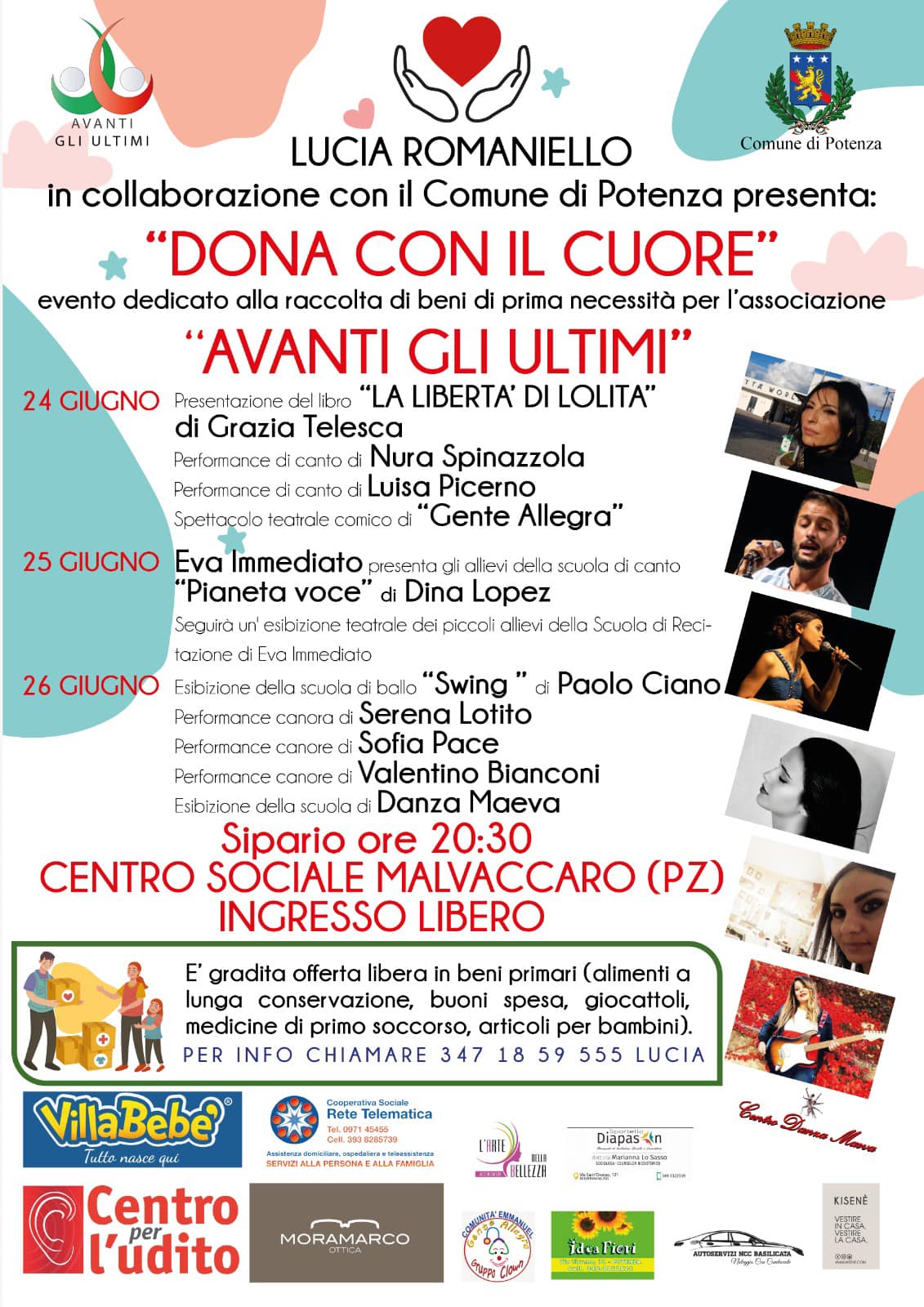 23.6.2022 – ore 12,50: Tre giorni per incontrare le persone meno fortunate e aiutarle attraverso gesti concreti. Sono quelli in programma al Centro sociale di Malvaccaro dal 24 al 26 giugno, che saranno realizzati grazie alla collaborazione dell’associazione ‘Avanti gli ultimi’ con il Comune, con una serie di appuntamenti tutti all’insegna della solidarietà. La presidente dell’associazione Antonella Tancredi, insieme a Lucia Romaniello e all’assessore alle Politiche sociali Fernando Picerno, indicano l’iniziativa come “un’occasione per confermare fattivamente, per l’ennesima volta, quanto la comunità potentina sia solidale con le persone che si trovano in un periodo di bisogno e per evidenziare come il mondo dell’arte sia sensibile a questi temi e pronto a fornire il proprio contributo, offrendo performance e momenti piacevoli a tutti coloro che vorranno partecipare alle diverse manifestazioni”. Le mattinate, a cominciare dalle 9, saranno interamente dedicate a screening gratuiti che riguarderanno diverse patologie, visite alle quali saranno sottoposte persone che si trovano in situazioni di indigenza, e che saranno eseguite in parte in un camper che stazionerà nei pressi del Centro sociale in parte negli studi medici dei dottori che garantiranno il servizio. Gli screening vanno prenotati al numero di telefono 3471859555. Per le serate, sipario previsto alle 20,30. Si comincerà il 24 giugno con la presentazione del libro ‘La libertà di Lolita’, di Grazia Telesca, le esibizioni canore di Nura Spinazzola e Luisa Picerno e lo spettacolo teatrale comico di ‘Gente allegra’. Il 25 giugno, allo stesso orario, Eva Immediato presenterà gli allievi della scuola di canto ‘Pianeta voce’ di Dina Lopez, a seguire, saranno i piccoli allievi della scuola di recitazione, sempre di Eva Immediato, a esibirsi. La sera del 26 giugno sarà la volta della scuola di ballo di Paolo Ciano ‘Swing’ e della scuola di danza ‘Maeva’ , con brani eseguiti da Serena Lotito, Sofia Pace e Valentino Bianconi. L’ingresso alla manifestazioni serali è totalmente libero, anche se gli organizzatori fanno sapere che è gradita l’offerta di beni primari a lunga conservazione, buoni spesa, giocattoli, medicine e articoli per bambini, tutto materiale che sarà destinato alle famiglie in difficoltà.
