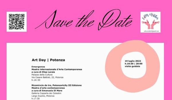 15 Luglio 2022 Art day 19 luglio, ore 16.30/20Visite guidate ore 16.30, Palazzo della Cultura: Emergenze. Mostra d’arte contemporaneaore 17.30, Cappella dei Celestini: Ricomincio da treore 18.30, via Pretoria: L’arte nel vento Locandina