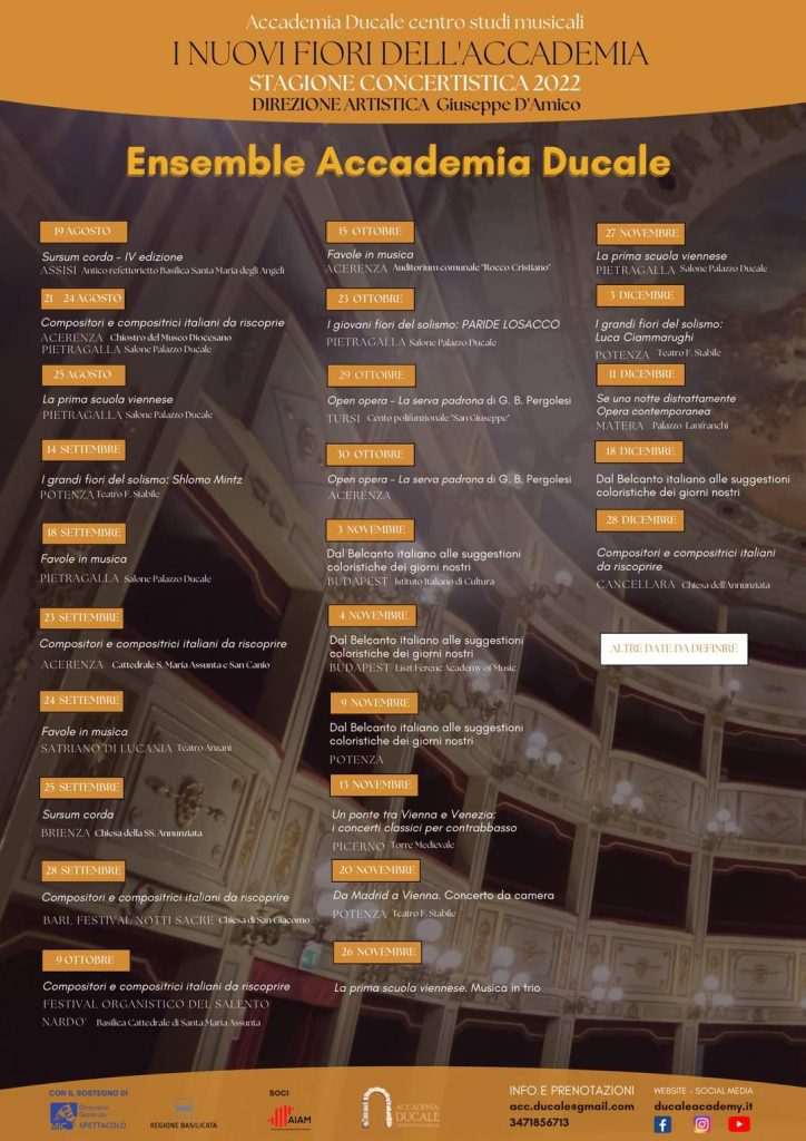 L’evento rientra nel cartellone della Stagione concertistica “I nuovi fiori dell’Accademia” dell’Accademia Ducale centro studi musicali, che ha ottenuto il riconoscimento del Ministero della Cultura – Direzione Generale Spettacolo per il triennio 2022-2024.