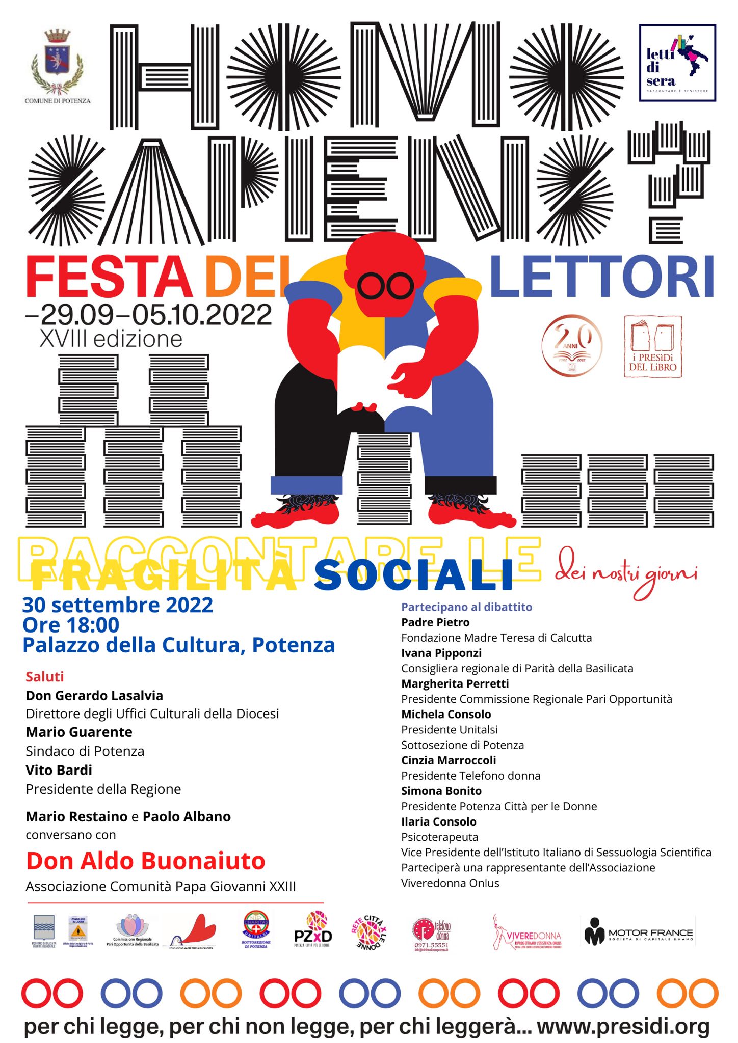 29.09.2022 – ore 15,55: Sarà don Aldo Bonaiuto, dell’associazione Comunità Giovanni Paolo XXIII, a conversare con il presidente regionale dell’Ordine dei giornalisti Mario Restaino e con Paolo Albano presidente dell’associazione culturale ‘Letti di Sera’, nell’appuntamento ‘Raccontare le fragilità sociali dei nostri giorni’, in programma venerdì 30 settembre 2022, alle ore 18, nel Palazzo della Cultura, in via Cesare battisti, 22. L’iniziativa si inserisce nell’ambito della XVII ‘Festa dei lettori – Homo Sapiens?’, in programma dal 29 settembre al 5 ottobre. Alla serata saranno presenti il presidente della giunta regionale di Basilicata, Vito Bardi, il Sindaco di Potenza Mario Guarente, il direttore degli uffici culturali della Diocesi di Potenza – muro Lucano – Marsico Nuovo, don Gerardo Lasalvia. Interverranno nel dibattito padre Pietro Anastasio della fondazione ‘Madre Teresa di Calcutta’, Ivana Pipponzi, Consigliera regionale di Parità della Basilicata, Margherita Perretti presidente della Commissione regionale Pari opportunità, Michela Consolo presidente della Sottosezione di Potenza dell’Unitalsi, Cinzia Marroccoli presidente di ‘Telefono donna’, Simona Bonito presidente ‘Potenza Città per le Donne’, Ilaria Consolo Psicoterapeuta, vicepresidente dell’Istituto italiano di sessuologia scientifica. Sarà presente anche una rappresentante dell’associazione ‘Viveredonna onlus’.