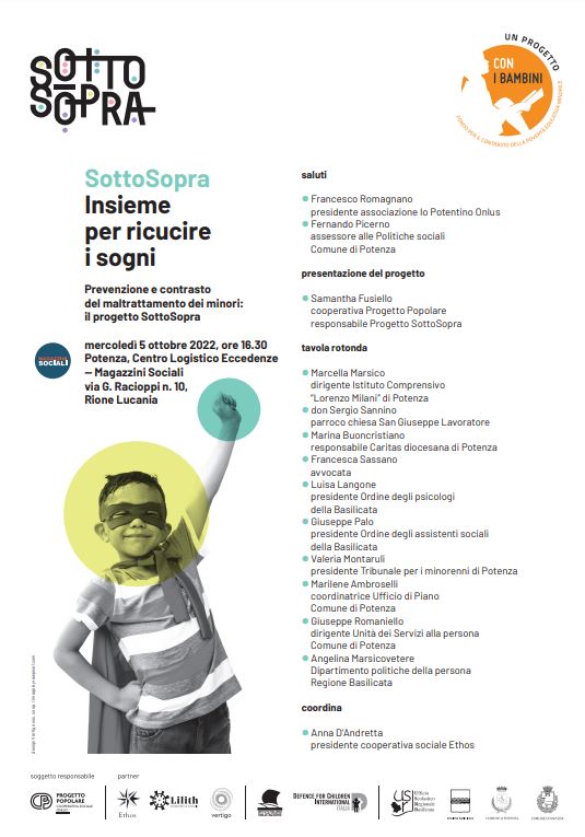 3.10.2022 – ore 11,40: Sarà presentato mercoledì 5 ottobre 2022, alle 16,30, nel Centro logistico Eccedenze – Magazzini sociali, in via Racioppi n.10, rione Lucania, il progetto ‘Sottosopra’ – Insieme per ricucire i sogni, iniziativa che sarà illustrata dalla responsabile Samantha Fusiello, della Cooperativa Progetto Popolare. L’appuntamento, nel corso del quale sarà affrontato il tema della prevenzione e contrasto del maltrattamento dei minori, vedrà i saluti iniziali affidati all’assessore alle Politiche sociali Fernando Picerno e al presidente dell’associazione ‘Io Potentino onlus’ Francesco Romagnano. A seguire prevista una tavola rotonda alla quale prenderanno parte la dirigente dell’Istituto comprensivo ‘Lorenzo Milani’ Marcella Marsico, il parroco di San Giuseppe don Sergio Sannino, la responsabile della Caritas diocesana Marina Buoncristiano, l’avvocata Francesca Sassano, la presidente dell’Ordine degli Psicologi di Basilicata Luisa Langone, il presidente dell’Ordine degli Assistenti sociali di Basilicata Giuseppe Palo, la presidente del Tribunale per i minorenni Valeria Motaruli, la coordinatrice dell’Ufficio di Piano comunale Marilene Ambroselli, il dirigente dell’Unità di direzione comunale ‘Servizi alla Persona’ Giuseppe Romaniello, Angelina Marsicovetere per il Dipartimento regionale Politiche alla persona. Sarà Anna Andretta, presidente della cooperativa sociale Ethos a coordinare gli interventi.