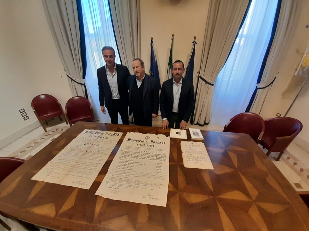 18.10.2022 – ore 16,10: E’ stato Antonio Perretti, figlio di Vincenzo Perretti, storico del capoluogo di regione, a donare al Sindaco di Potenza, Mario Guarente, tre manifesti murari storici che riportano informazioni che i Sindaci Addone, Malfitani e Padula diedero alle rispettive comunità che amministrarono. Ad accompagnarlo il consigliere comunale Piero Calò che si è interessato affinché i documenti, insieme a testi storici della famiglia Perretti, potessero essere consegnati al Primo Cittadino e, quindi alla cittadinanza tutta. In particolare si tratta di un invito del Sindaco Domenico Addone datato 7 gennaio 1879, con il quale i potentini sono sollecitati a “pregare per la pace per la grande anima” di Vittorio Emanuele II, in Cattedrale, in occasione dell’anniversario della sua morte. Il secondo, a firma del ‘Professore Cavaliere’ Filippo Malfitani, è datato 9 giugno 1892, ed è l’avviso d’asta per gli “appalti delle opere e provviste occorrenti al completamento e ampliamento dell’Edifizio Comunale in Piazza Sedile e sue destinazioni ad Uffici del Municipio di Potenza, della Posta, del Telegrafo e della Pretura Mandamentale di detta Città, per la presunta complessiva somma di L. 125690.44”. L’ultimo in ordine temporale è quello che riporta un’ordinanza emessa l’11 ottobre 1916, che vede il Sindaco dell’epoca, Domenicantonio Padula, disporre tassativamente i luoghi “interni della città, destinati a pubblico mercato” dove vendere le uova di pollame: “Largo Duomo – Largo Liceo – Largo Trinità – Piazza Maffei – Largo dietro S. Michele”. “Ringrazio Antonio Perretti e tutta la famiglia di Vincenzo Perretti per aver voluto far dono di questi preziosissimi documenti e testi alla nostra Città. Avremo cura – ha assicurato il sindaco Guarente – di custodirli e di esporli, per quanto riguarda i manifesti, nella Sala dell’Arco del Palazzo di Città, così che sia i potentini sia i turisti possano prenderne visione e conoscere alcuni aspetti singolari e di grande interesse che riguardano il passato della nostra comunità”.