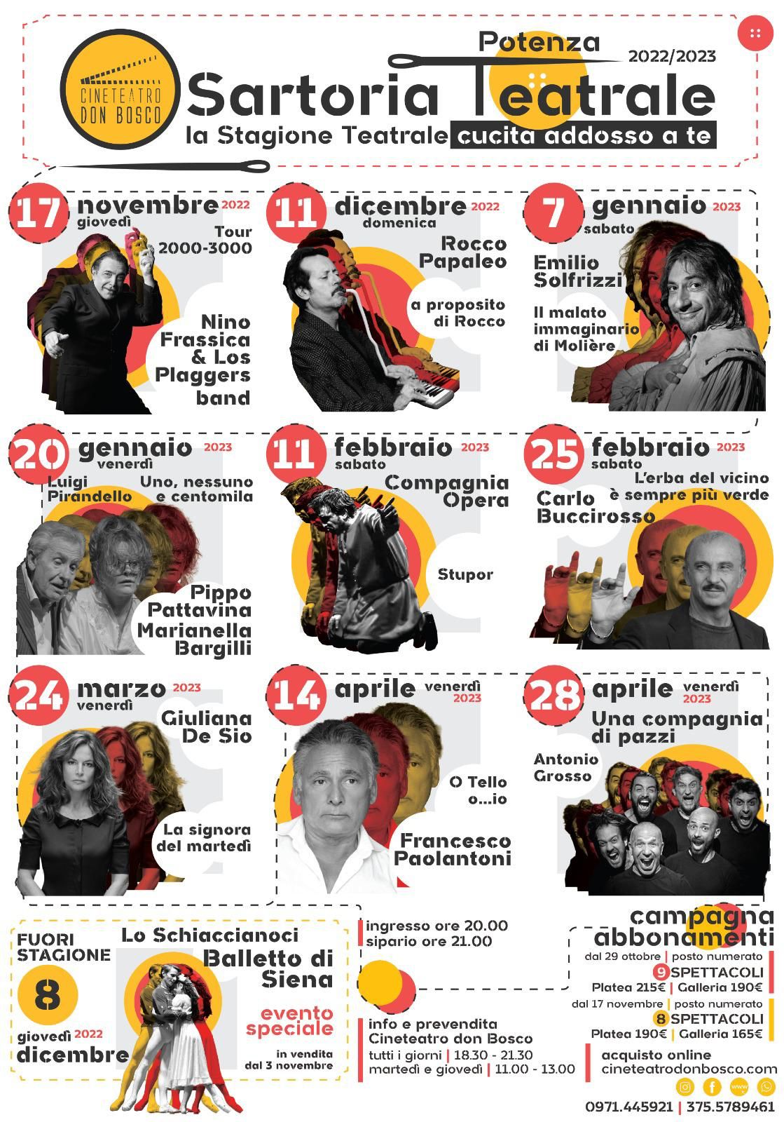 14 Novembre 2022 Sartoria Teatrale ‘La stagione teatrale cucita addosso a te’ Dal 17 novembre 2022 al 28 aprile 2023Cine teatro Don Bosco – Potenza Programma Download