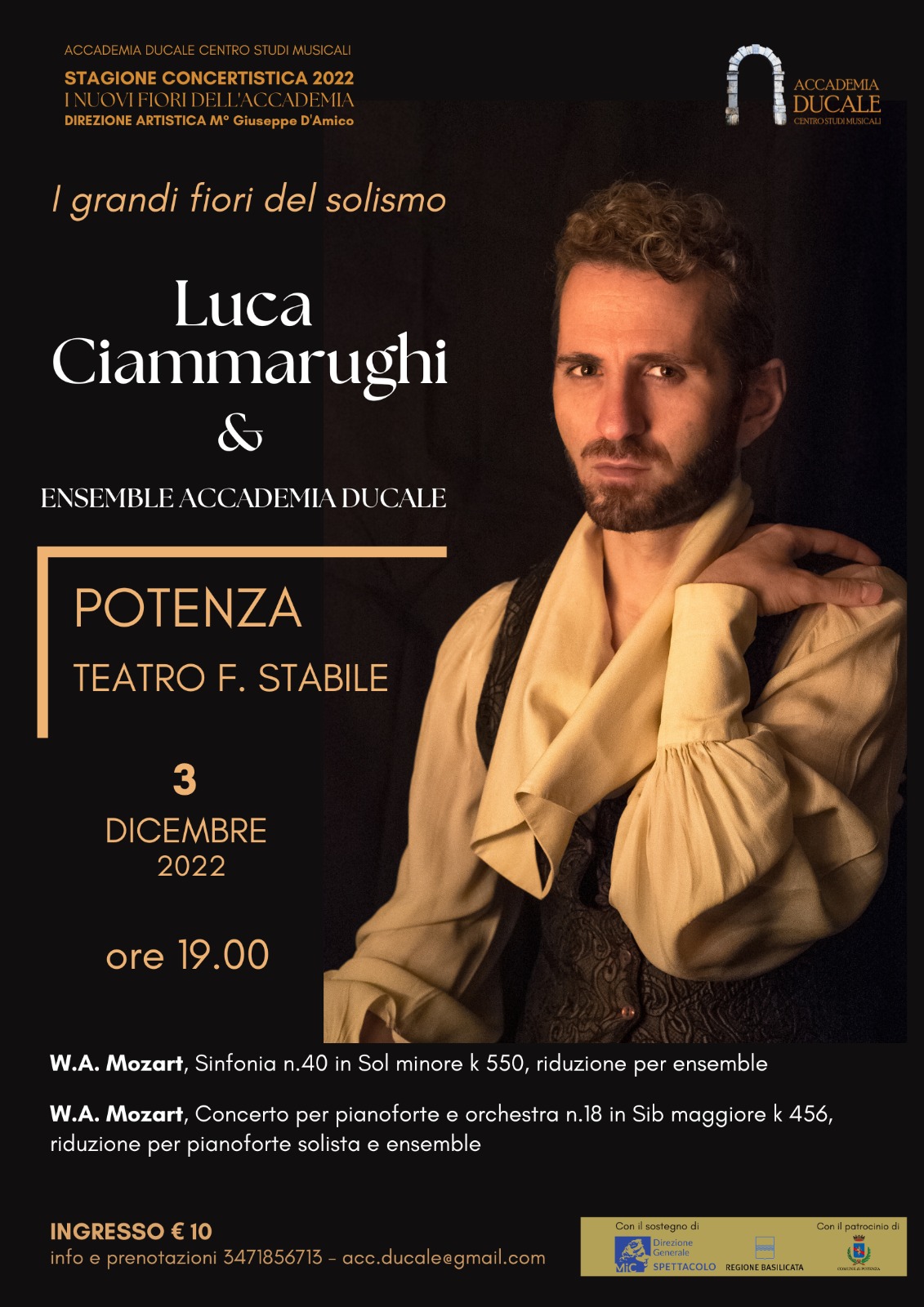 28.11.2022 – ore 10,45: Il 3 dicembre 2022 l’Accademia Ducale centro studi musicali ospiterà a Potenza, nel Teatro Stabile, per la prima volta in Basilicata, il celebre pianista Luca Ciammarughi che eseguirà da solista, con l’Ensemble Accademia Ducale, il Concerto per pianoforte e orchestra n.18 in Sib maggiore K 456, di W. A. Mozart, riduzione per pianoforte solista e ensemble.