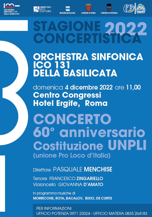 30.11.2022 – ore 9,45: Prima uscita istituzionale per l’Orchestra sinfonica ICO 131: giovedì 1 dicembre alle ore 10, nella Sala degli Specchi del teatro Stabile di Potenza, nel corso di una conferenza stampa, sarà presentato il concerto in programma all’Hotel Ergife di Roma, il prossimo 4 dicembre, in occasione dei 60 anni dell’Unpli. Si tratta dell’appuntamento di punta nell’ambito della due giorni organizzata dall’Unione Nazionale delle Pro Loco d’Italia in occasione del 60esimo anniversario della costituzione dell’UNPLI, alla presenza delle massime cariche istituzionali e di governo. Sarà la prima iniziativa di caratura istituzionale che, per la prima volta, vedrà impegnati, contemporaneamente in scena, i tre soci fondatori e componenti del Comitato artistico: il Maestro e Direttore d’Orchestra Pasquale Menchise, il tenore Francesco Zingariello e la violoncellista Giovanna D’Amato.