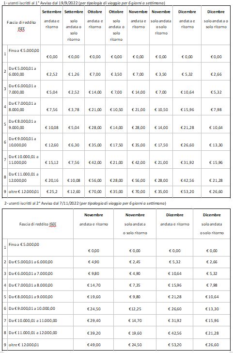 2.12.2022 – ore 13,40: Pubblicato l’avviso per il pagamento della prima rata per la fruizione del servizio di trasporto scolastico per l’anno 2022/2023 relativa ai mesi di settembre, ottobre, novembre e dicembre 2022. Gli importi dovuti dovranno essere corrisposti dal 2 dicembre 2022 al 23 dicembre 2022, secondo la tariffa attribuita in ragione della fascia ISEE di appartenenza, secondo quanto indicato nei seguenti prospetti: