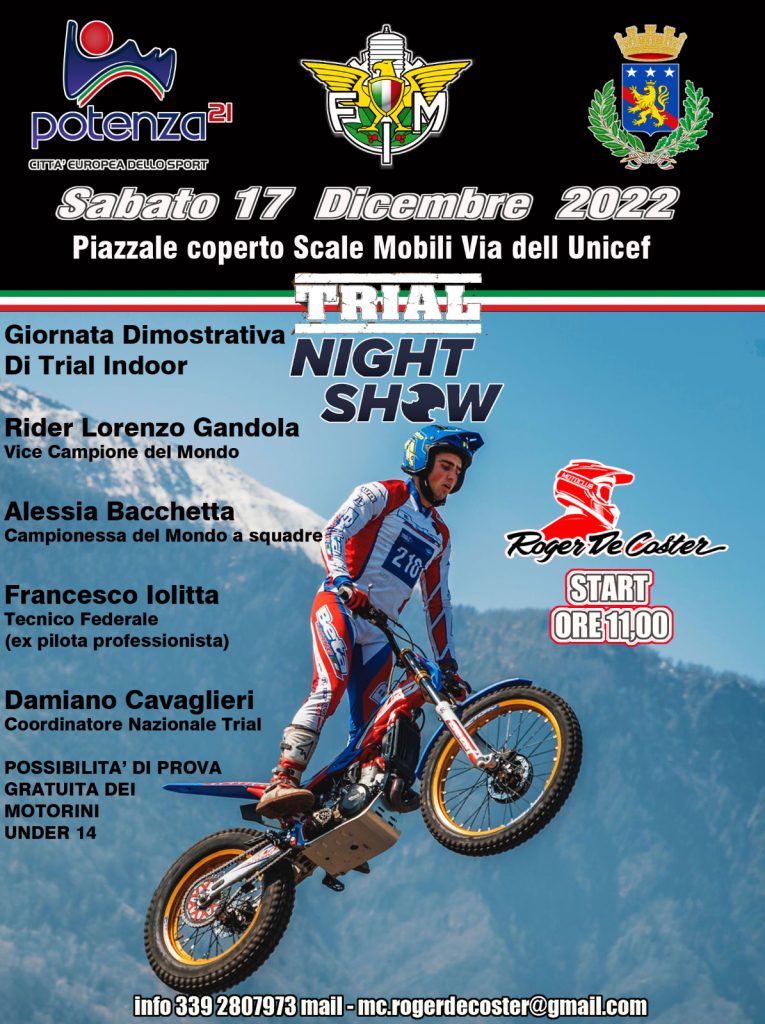 15.12.2022 – ore 12: Per la prima volta nel capoluogo lucano una giornata dimostrativa di ‘Trial indoor’. L’appuntamento è fissato per sabato 17 dicembre a cominciare dalle ore 11, nel piazzale coperto della scale mobili, viale dell’Unicef. Parata di star del motociclismo acrobatico si esibiranno su percorsi appositamente studiati per offrire un grande spettacolo a quanti assisteranno alla manifestazione. Lorenzo Gandola, vice campione del mondo, Alessia Bacchetta, campionessa del mondo a squadre, Francesco Iolitta, ex pilota professionista e attuale tecnico federale, Damiano Cavaglieri, coordinatore nazionale trial. “Ringrazio il Motor club ‘Roger De Coster’ e la Federazione motociclistica italiana per aver realizzato l’importante appuntamento che, come Amministrazione abbiamo ritenuto di patrocinare. La mia riconoscenza a Stefano Miglionico per aver organizzato con grande attenzione e professionalità l’evento e alla consigliera comunale Stefania Polese, che si impegnata affinché l’iniziativa fosse sostenuta dal Comune. Significativa anche la possibilità offerta ai minori di 14 anni di provare, nel corso della giornata, la guida di moto adatte alla loro età. Infatti – prosegue l’assessore allo Sport Gianmarco Blasi – l’intento, oltre a quello di far conoscere uno sport particolare, capace di esaltare le capacità di guida, di equilibrismo e fisiche di quanti lo praticano, è quello di diffondere l’interesse per tutti i tipi di pratica sportiva, avvicinare i più giovani a realtà in qualche caso meno note, e promuovere attività e stili di vita salutari e che, col divertimento, favoriscano contestualmente l’aggregazione e la socializzazione”.