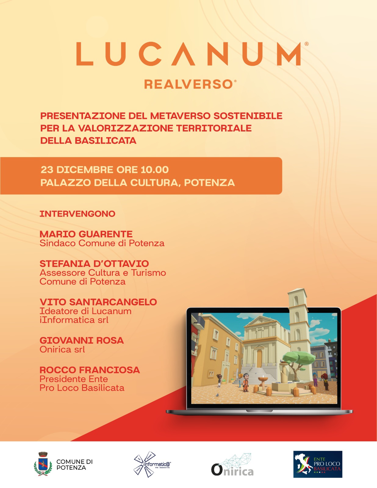 21.12.2022 – ore 10,55: Si terrà venerdì 23 dicembre 2022 alle ore 10, nel Palazzo della Cultura del Comune di Potenza, in via Cesare Battisti n.22 la conferenza stampa di presentazione del ‘Realverso Lucanum’. Interverranno Mario Guarente, il Sindaco di Potenza, Mario Guarente, Stefania D’Ottavio, assessore alla Cultura e al Turismo, Vito Santarcangelo, ideatore di Lucanum e amministratore unico di iInformatica srl, Giovanni Rosa, Onirica srl e Rocco Franciosa, presidente Ente Pro Loco Basilicata.