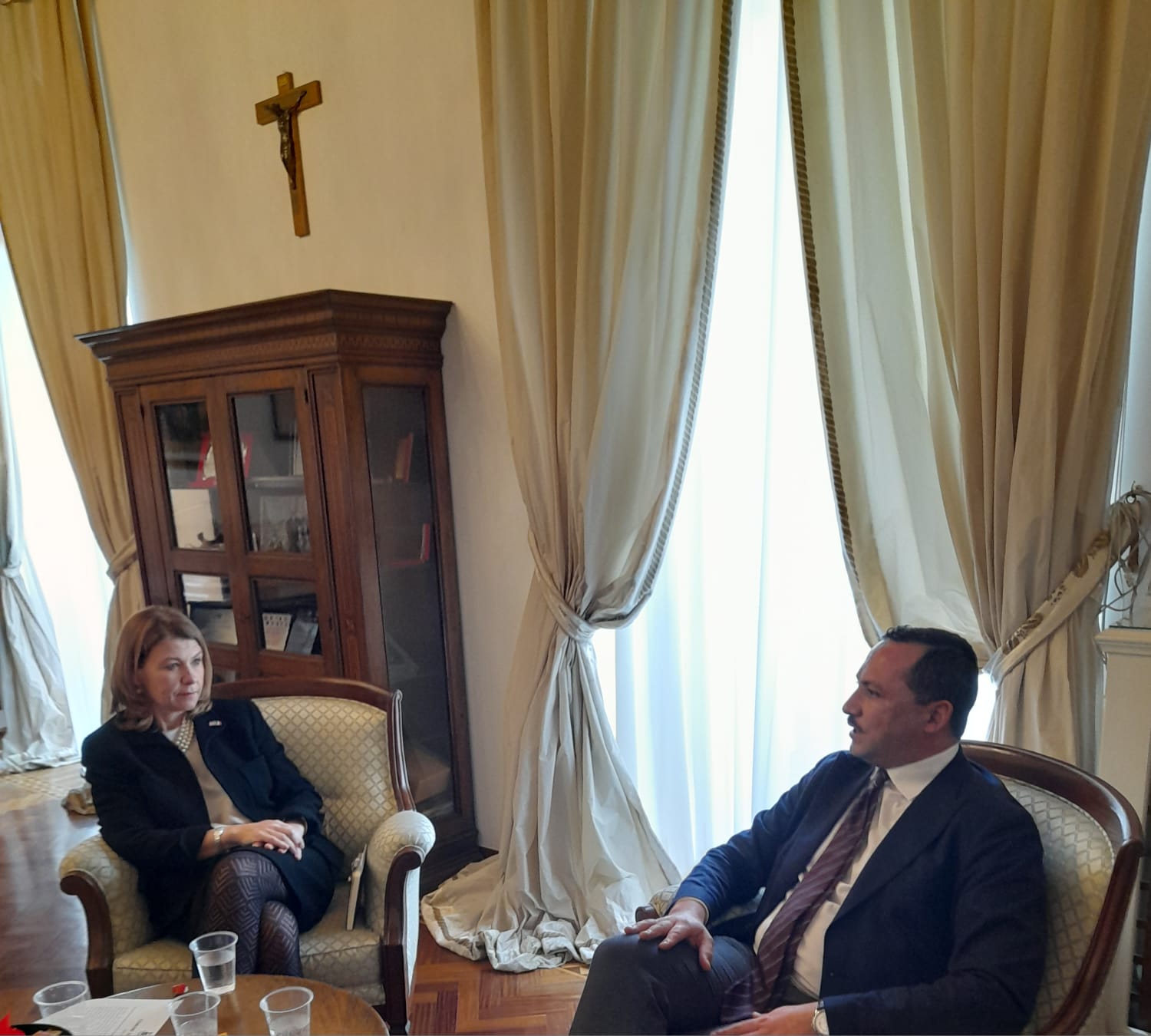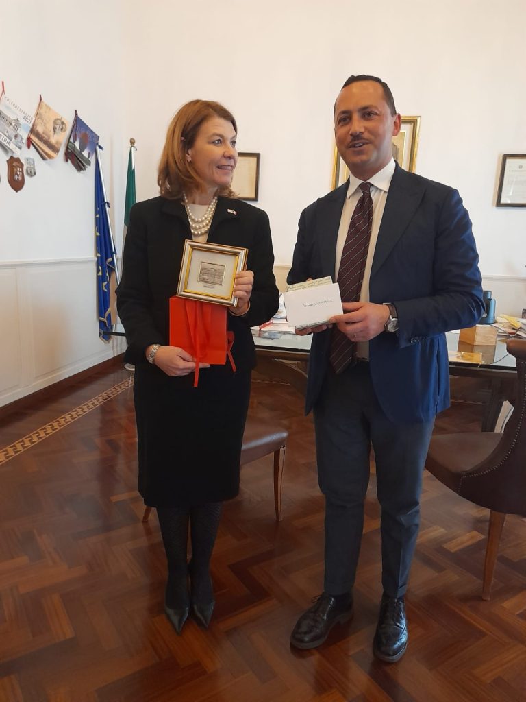 Una carriera importante e articolata per la quale si è potuta avvalere anche della conoscenza di tre lingue straniere, spagnolo, arabo e italiano e, proprio nel suo corretto e fluente italiano, ha avuto modo di interloquire con il sindaco Guarente, spiegando la finalità del suo incarico in Italia, quello di “intensificare i rapporti istituzionali in tutto il Sud Italia, tessere relazioni commerciali e culturali per costruire un futuro di prosperità soprattutto per i giovani del Sud, memori di un passato che spesso ha visto le nostre rispettive comunità progredire insieme coltivando gli stessi valori”. Il Sindaco nel dirsi onorato della presenza di una così “importante rappresentante della diplomazia americana” ha ribadito “la più completa disponibilità a prevedere un programma di collaborazione e di scambi culturali ed economici, magari progettando in sinergia e realizzando concretamente percorsi condivisi, per esempio attraverso gemellaggi come quello che quasi 39 anni la nostra città stipulò con quella di Denver, altro accordo da continuare ad alimentare e promuovere”.