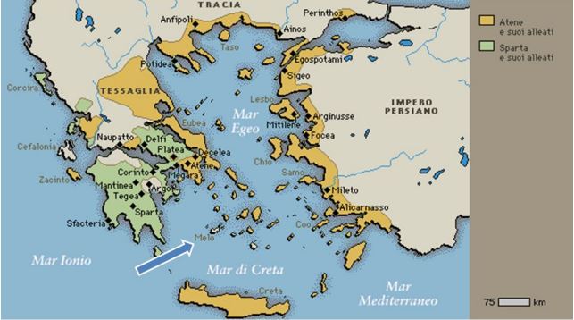 L’iniziativa muoverà da quanto accaduto nell’estate del 416 a.C. a Melo, isoletta legata a Sparta da vincoli di stirpe, con Atene che impose di accettare la propria egemonia basata sul diritto del più forte. Melo si trova costretta ad accettare il dominio e salvarsi, oppure resistere, subendo l’assedio e la distruzione della città. Gli Ateniesi avevano già circondato l’isola con un grosso apparato bellico e prima di dare inizio ai saccheggi, inviarono dei messi con il compito di