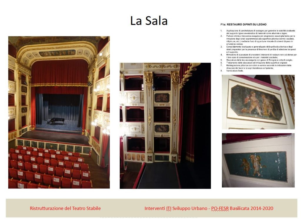 Al termine sono stati individuati la ditta Carlucci, che può vantare già lavori nel settore della riqualificazione di teatri storici, avendo operato in tal senso in Abruzzo, e l’architetto Di Nubila, che ci consentiranno di mettere a frutto i 750.000 euro a disposizione, rivenienti dai fondi PO-FESR Basilicata 2014-2020, per consegnare a Potenza il suo gioiello, più bello di come ci appare oggi, anzi di far sì che sempre più persone possano ammirarlo e apprezzarlo anche oltre i confini regionali”. Riguardo ai fondi, il dirigente dell’ufficio ‘Autorità di Gestione Fesr 2014-2020’ Antonio Bernardo, presente all’incontro, si è soffermato sulle “criticità affrontate e superate, per uno degli interventi che meglio centra l’obiettivo dell’azione 6 C. 6.7.1 dell’asse 5 del PO FESR Basilicata 2014-2020, quello che attiene alla valorizzazione e al recupero dei grandi attrattori e di beni di particolare pregio architettonico e storico”. Di “restauro conservativo – ha parlato il Sindaco di Potenza Mario Guarente, che ha rimarcato con forza come si tratti “né di uno stravolgimento, né di una mortificazione della storia, come qualcuno, evidentemente senza conoscere il progetto, si è affrettato a prospettare. Piuttosto c’è la volontà di restituire la dignità che merita al nostro teatro, l’unico teatro storico della nostra regione, alla realizzazione del quale i potentini sono particolarmente legati sin dal suo sorgere, quando si accollarono parte dei debiti per la sua edificazione, sancendo un legame che ancora oggi rimane fortissimo. Andremo così ad apporre un ulteriore tassello a quel mosaico storico culturale che, dal momento del nostro insediamento, ci ha visto aprire il Palazzo della Cultura, intervenire sulla Galleria Civica e operare nel senso di una maggiore fruibilità per la Cappella dei Celestini, fruibilità anche per le persone con disabilità, che abbiamo voluto potesse essere messa al primo posto nella riqualificazione dello Stabile”. L’architetto Di Nubila, muovendo proprio dall’aspetto legato all’accessibilità e alla fruizione dei servizi e degli spazi da parte delle persone con disabilità ha introdotto la sua presentazione con una serie di schede del progetto esecutivo, attraverso le quali ha sottolineato gli ambiti di intervento ed evidenziato la situazione attuale e gli obiettivi che ci si è prefissati.
