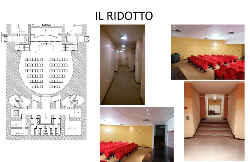 Nel ‘Ridotto’ saranno ripristinate e adeguate le finiture, sarà reso accessibile alle persone con disabilità motoria grazie all’adeguamento dell’ascensore e alla modifica dell’ingresso alla Sala, attraverso la realizzazione di una rampa gradonata. Sarà eseguita la sostituzione della pavimentazione e del rivestimento a parete. Interventi sull’illuminazione e di realizzazione di un nuovo impianto audio/video. Si provvederà a rendere agibile i servizi igienici a persone in carrozzina.