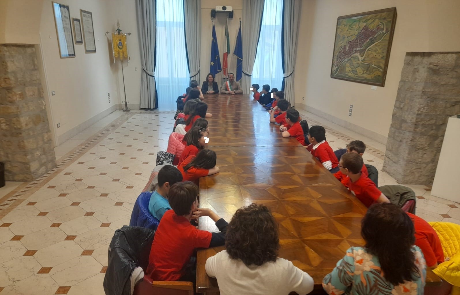 5.6.2023 – ore 11,10: Sono stati ricevuti dal sindaco Mario Guarente e dall’assessore all’Ambiente Maddalena Fazzari, nella Sala dell’Arco del Palazzo di Città, in piazza Matteotti, sede municipale nel centro storico di Potenza, gli alunni della classe quinta ‘B’, della scuola primaria dell’Istituto comprensivo ‘Busciolano’, accompagnati dalle docenti Gabriella Pesce e Daniela Valentini. “Un’occasione per avvicinare il mondo della scuola, e soprattutto i più giovani, alle Istituzioni – hanno spiegato le insegnati – che abbiamo voluto anche per rispondere alle tante curiosità manifestateci durante l’anno scolastico da nostri giovani allievi”. Nel corso dell’incontro, i giovanissimi studenti, hanno avuto modo di porre domande al Sindaco e all’assessore, relativamente ai compiti che i rispettivi ruoli richiedono loro. “Amministrare una città articolata e che svolge tante funzioni, essendo anche capoluogo di regione, non è semplice, ma dà anche tante soddisfazioni. Con l’assessore all’Ambiente e con gli altri componenti della Giunta e del Consiglio, diamo un indirizzo politico agli uffici comunali che gestiscono i tanti servizi che una città eroga, dallo smaltimento dei rifiuti alla viabilità, dalle gestione del verde pubblico a quella del trasporto, dal commercio ai permessi per l’edilizia, dalla protezione civile fino ai servizi cimiteriali, solo per citarne alcuni. Il nostro lavoro – ha proseguito il Sindaco – è anche teso a garantire una città più bella, in grado di guardare con fiducia alle sfide che il futuro potrà presentarci e che sappia andare incontro ai vostri sogni e alle vostre esigenze, provando a costruire insieme con voi e con i vostri suggerimenti la Potenza di domani, sempre più verde, sempre più vivibile, con sempre più parchi, con più giochi, con più piste ciclabili, con più possibilità di praticare sport e di vivere in maniera sana. Una città sempre più a misura d’uomo e soprattutto, una città sempre più a misura di bambini”.