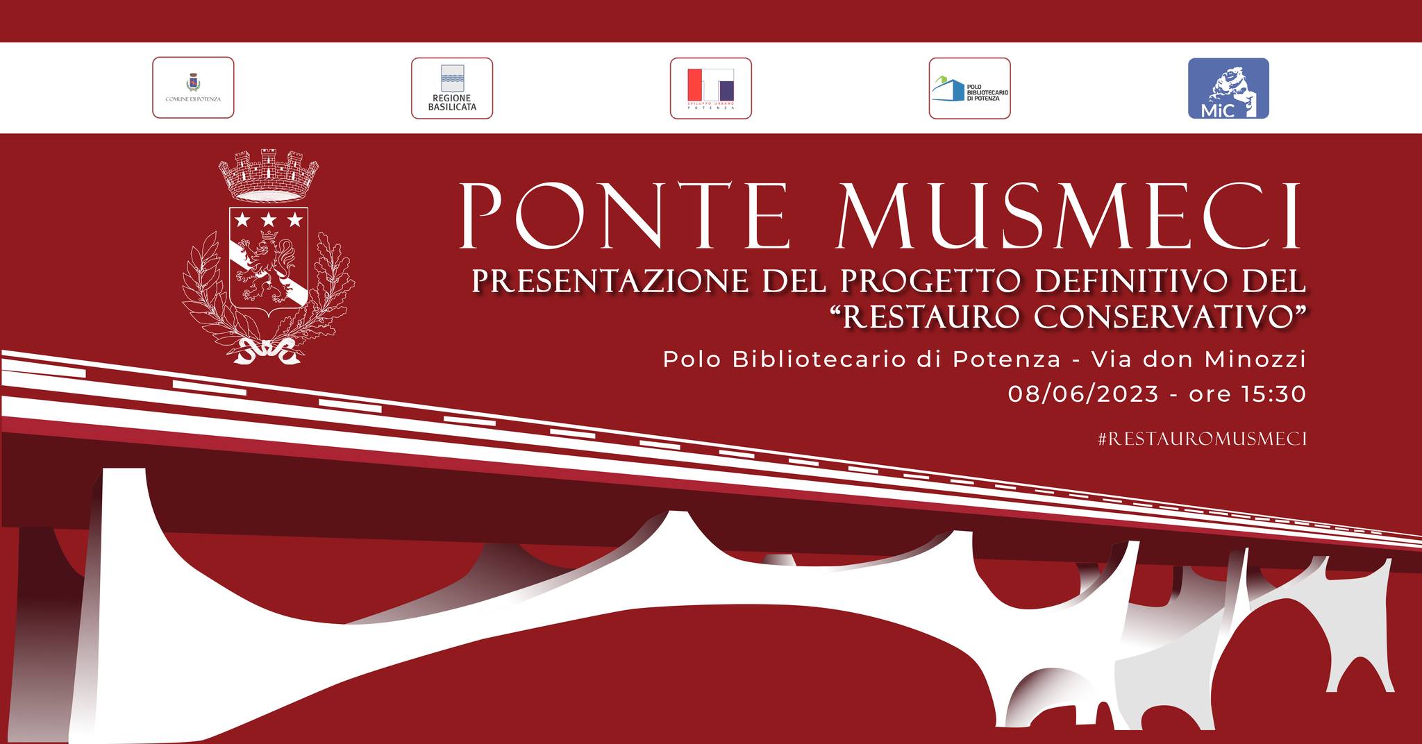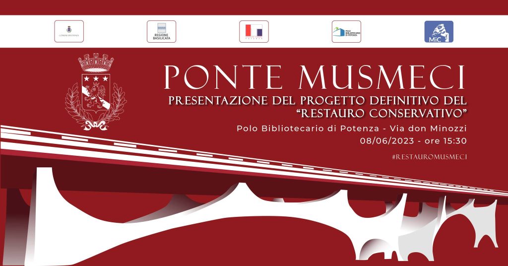 7.6.2023 – ore 12,40: Sarà presentato giovedì 8 giugno 2023 dalle ore 15,30 alle ore 18,30, nella Sala Conferenze del nuovo Polo Bibliotecario di Potenza, in via don Minozzi, il progetto definitivo del ‘Restauro conservativo del Ponte Musmeci’.