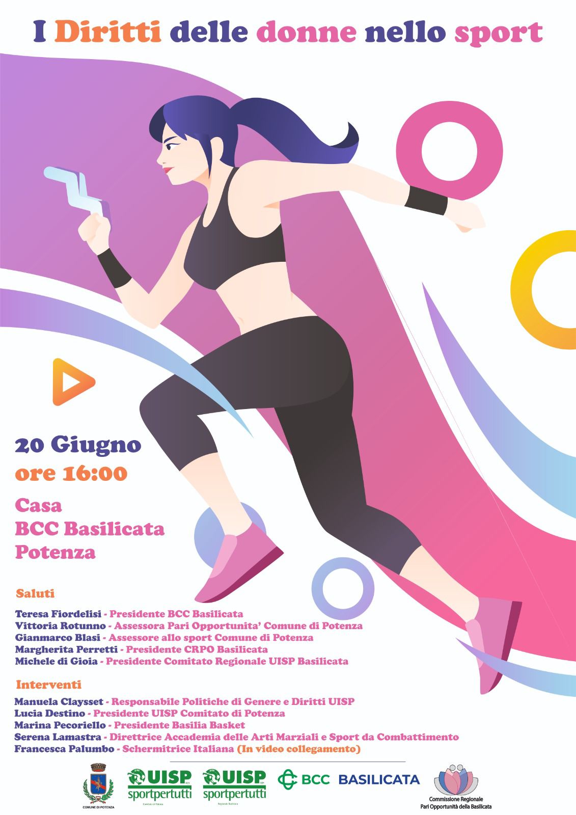 16.6.2023 – ore 10,15: La Commissione regionale Pari Opportunità, insieme all’assessore allo Sport del Comune di Potenza Gianmarco Blasi e all’assessore alle Pari Opportunità Vittoria Rotunno, con il patrocinio del Comitato di Potenza e del Comitato regionale di Basilicata Uisp, ha organizzato un incontro sul tema ‘I diritti delle donne nello sport’, in programma a Potenza, martedì 20 giugno alle ore 16, nell’Auditorium Casa Bcc Basilicata, piazza Vittime sul Lavoro n.2