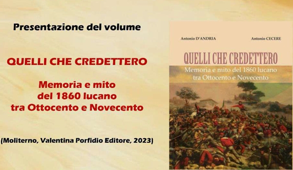 Venerdì 25 agosto alle ore 19.00 nel chiostro della chiesa di San Michele Arcangelo a Potenza, l’associazione “We Love Potenza”, in collaborazione con il blog “Di Storia, di storie”, presenterà il volume “Quelli che credettero”, memoria e mito del 1860 lucano tra Ottocento e Novecento di Antonio D’Andria e Antonio Cecere.