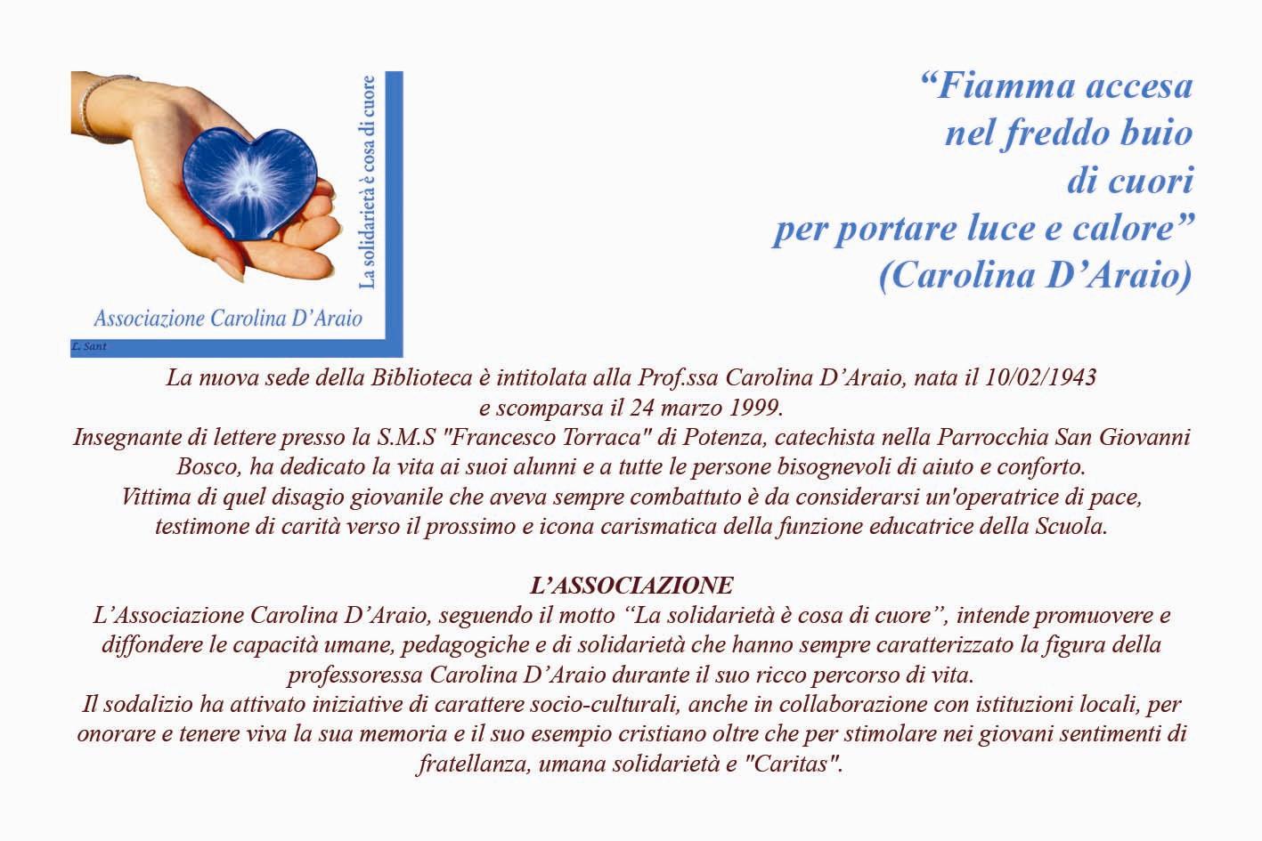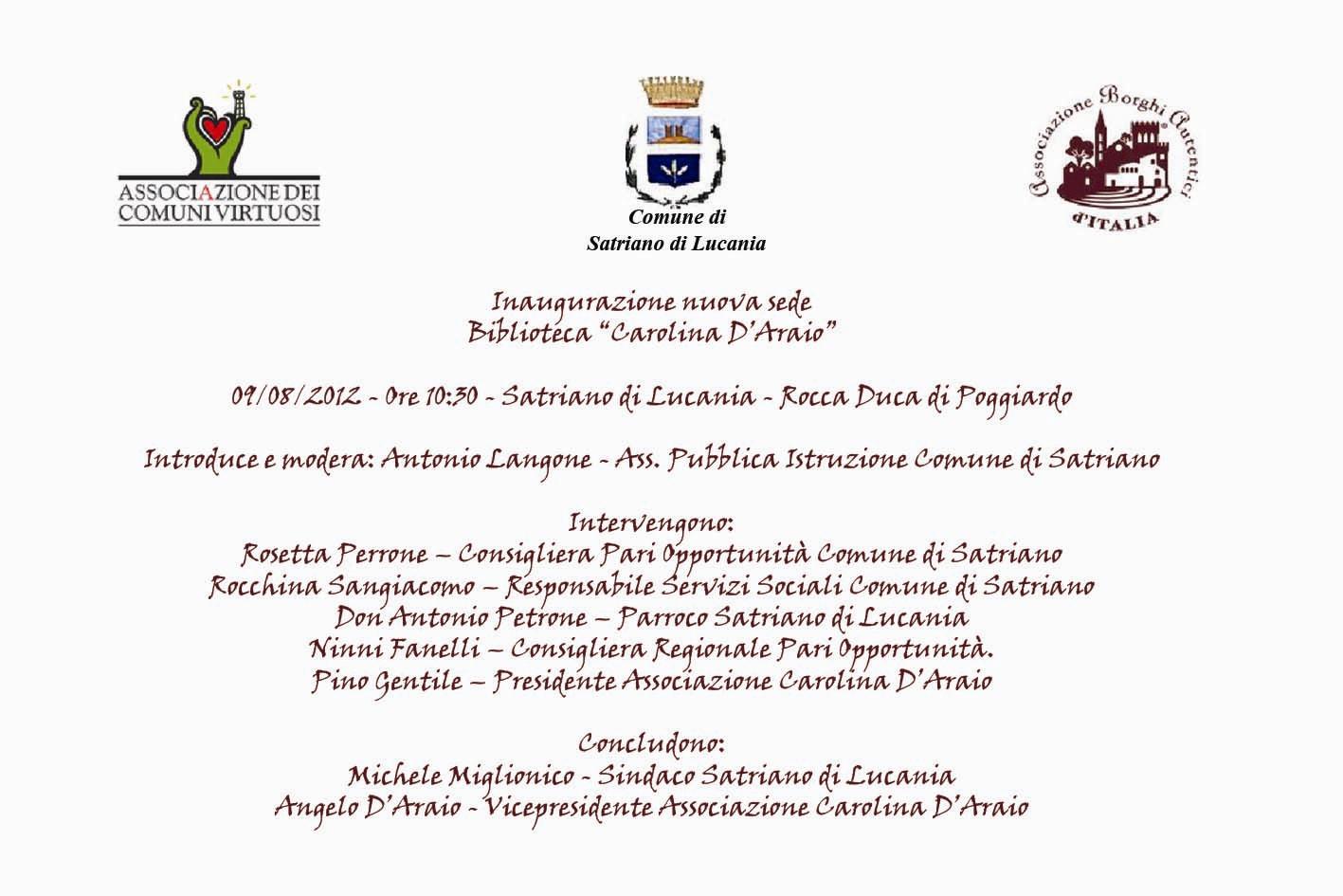 8 Agosto 2012 Carolina D’Araio Inaugurazione nuova sede Biblioteca “Carolina D’Araio” Rocca Duca di Poggiardo, Satriano di Lucania (PZ) 9 agosto, ore 10.30 invito2.jpginvito1.jpg