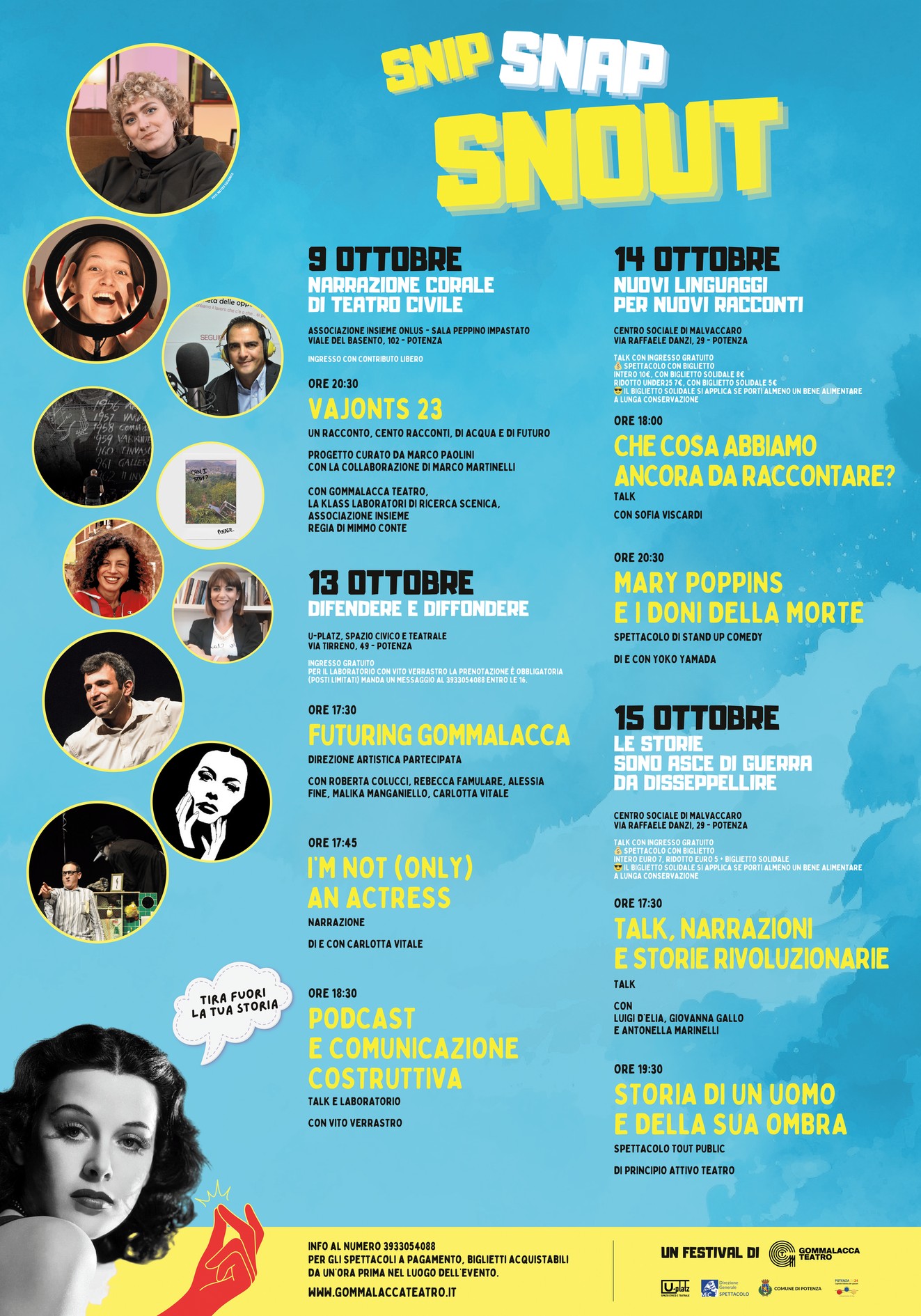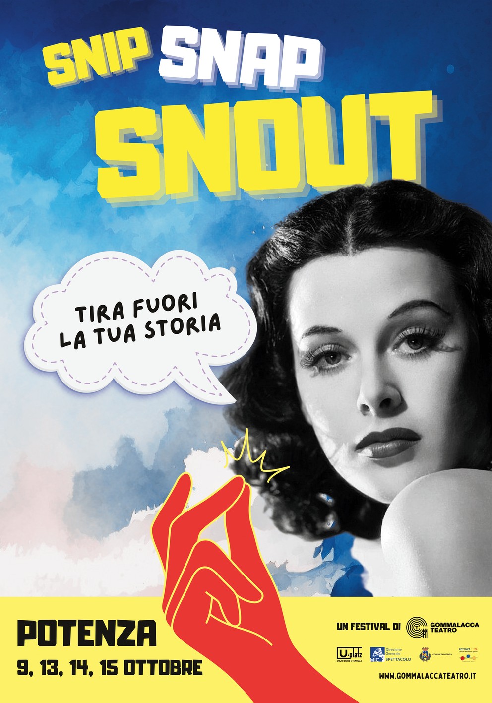 Entra nel vivo a Potenza “Snip Snap Snout – Tira fuori la tua storia”, il festival creato con la Generazione Z per la Generazione Z, che, dopo l’apertura dello scorso 9 ottobre, andrà in scena a Potenza dal 13 al 15 ottobre, organizzato da Gommalacca Teatro e U-Platz – Spazio civico e teatrale, con il patrocinio di Ministero della Cultura – Direzione Generale Spettacolo e Comune di Potenza.