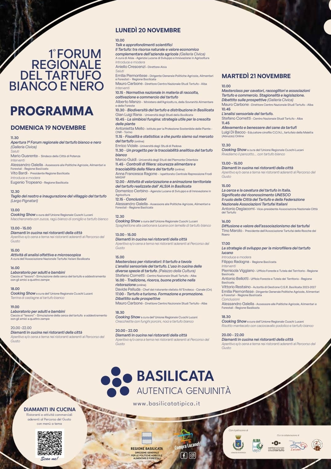 Ad aprire i lavori, domenica 19 novembre, alle 11.30, nella Galleria Civica, il presidente della Regione Basilicata, Vito Bardi, insieme al sindaco della Città di Potenza, Mario Guarente, e all’assessore regionale alle Politiche agricole, Alessandro Galella, condotti da Eugenio Tropeano della Regione Basilicata. Seguirà il taglio del nastro e l’inaugurazione del villaggio del tartufo in Largo Pignatari, dove saranno presenti le nove imprese lucane: I tartufi della collina lucana di Calvello (Pz); Viggiani Tartufi di San Mauro Forte (Mt); La Radice Srl di Avigliano (Pz); l’Associazione Nazionale Tartufai Italiani di Scanzano Jonico (Mt); Vivai Azzato di Satriano di Lucania; Pellitta Truffles di Policoro (Mt); APS Tartufai del Serrapotamo di Carbone (Pz); Azienda Agricola Doino e Corto Circuito di Bella per la promozione del pregiato prodotto.