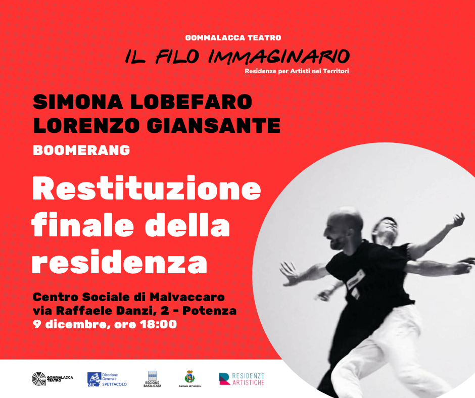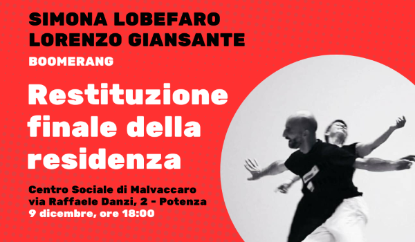 Dal 26 novembre i coreografi e performer romani Simona Lobefaro e Lorenzo Giansante sono in residenza a Potenza con il progetto “Boomerang”. Al centro dell’indagine vi è una danza che si mette a disposizione, si offre, in continua tensione tra l’aderire alle premesse coreografiche e il farsi contaminare da stimoli esterni. Una danza che non si possiede, ma che è piuttosto il frutto di un processo di confronto. Risvegliando nei corpi quelle sensibilità del peso e dello scorrimento energetico essenziali per relazionarsi allo spazio, Simona e Lorenzo hanno proposto un lavoro individuale e relazionale che oscilla continuamente fra danza e osservazione.
