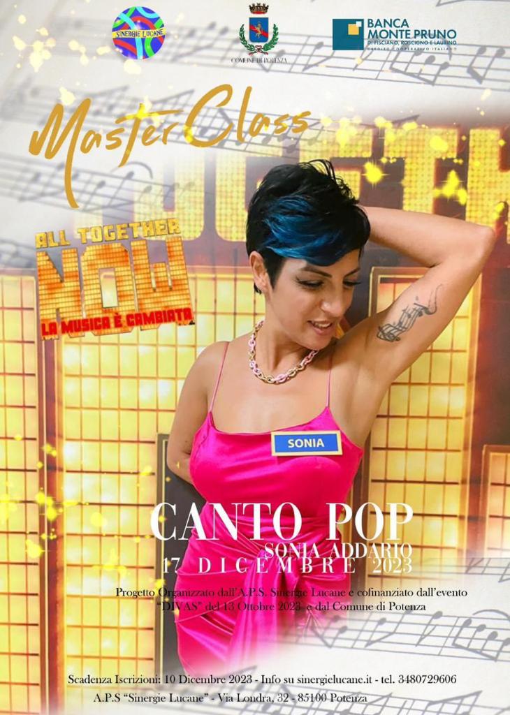 15.12.2023 – ore 12: Il Comune di Potenza e l’Associazione di Promozione Sociale Sinergie Lucane, in collaborazione con la Banca Monte Pruno, nell’ambito dell’evento Divas, che si è svolto lo scorso 13 ottobre al Cineteatro Don Bosco di Potenza, organizzano una masterclass di canto pop a cura della cantante e vocal coach Sonia Addario, ospite del programma Mediaset ‘All together now’ e docente al Conservatorio di Nocera Terinese, Catanzaro. “La masterclass, totalmente gratuita, nasce dalla volontà di investire concretamente sul talento e sulla passione dei giovani lucani, guidandoli nel loro percorso di crescita, con l’obbiettivo di sensibilizzare affinché sia istituito anche nei conservatori della Basilicata il corso di laurea in canto pop” spiegano gli organizzatori.
