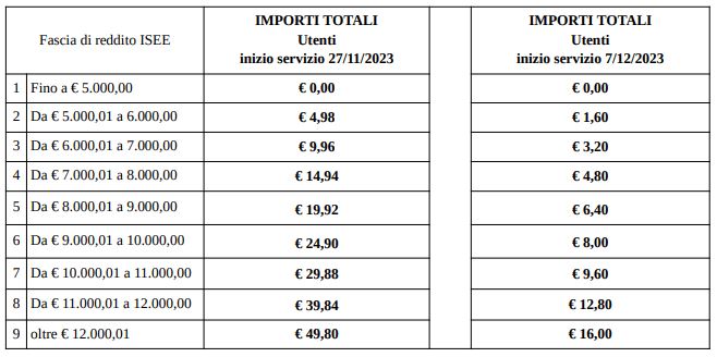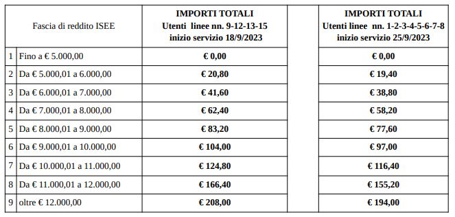 19.12.2023 – ore 12,30: Resi noti gli importi totali della prima rata (mesi di settembre – ottobre – novembre – dicembre 2023) per la fruizione del servizio di trasporto scolastico per l’anno scolastico 2023-2024, che vanno corrisposti dal 20 dicembre 2023 al 23 gennaio 2024, secondo la tariffa attribuita in ragione della fascia ISEE di appartenenza, come da prospetti: