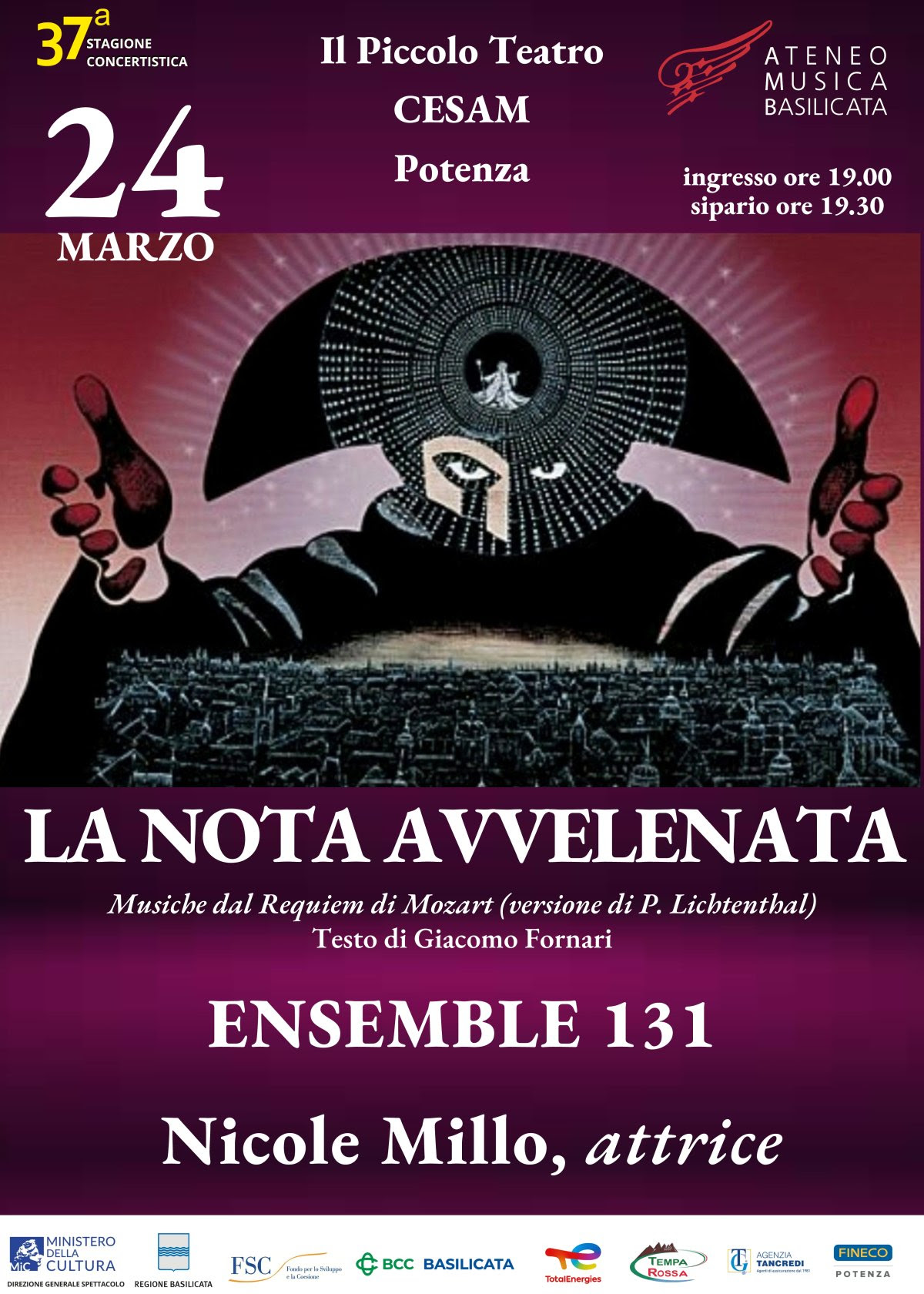 Diversi studiosi e musicologi si sono occupati della morte di Mozart. Ma nessuno è riuscito dare una ricostruzione esaustiva del caso. Una vera e propria indagine sulla morte di Wolfgang Amadeus Mozart sulle note del Requiem in re minore Kv 626 nella trascrizione per soli archi di Peter Lichtenthal. “La nota avvelenata” del musicologo Giacomo Fornari è il risultato di un lungo e articolato lavoro di ricerca che entra a far parte dello spettacolo, svolto su documenti reali e sconvolgenti che portano una magistrata a riaprire il caso dopo 200 anni.