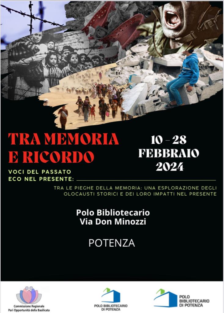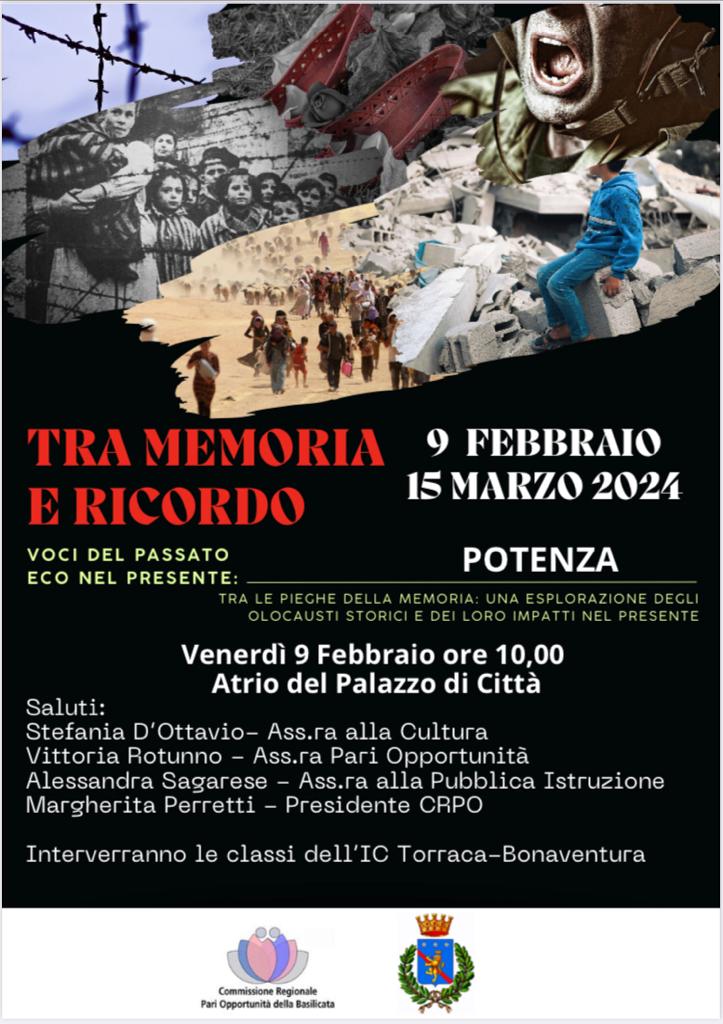 Ricordare è l’esercizio della libertà e il percorso della consapevolezza. La memoria, tuttavia, non è solo diritto, ma dovere di comunità. E’ questo il senso della installazione di fotografie “dalla memoria al ricordo”, che la Commissione Regionale Pari Opportunità ha inaugurato il 9 febbraio a Potenza nell’atrio del Palazzo di Città, per ricordare gli eventi più atroci della storia, dall’olocausto alle foibe, fino alle guerre in corso.