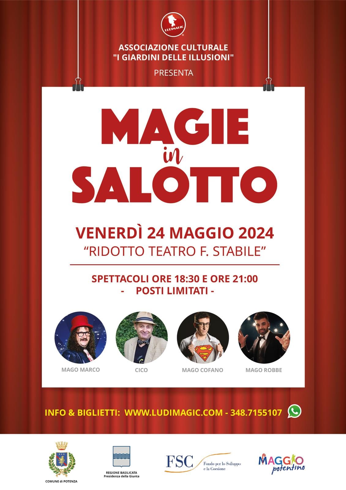 20.05.2024 – ore 13,45: Giochi di prestigio, intrattenimento e cenni di cultura magica: un doppio appuntamento al Ridotto del Teatro ‘F. Stabile’, che riapre al pubblico in tutto il suo splendore dopo essere stato oggetto di importanti lavori di ristrutturazione e adeguamento. Appuntamento venerdì 24 maggio con “Magie in salotto” a cura dell’Associazione culturale ‘I giardini delle illusioni’, con il sostegno del Fondo per lo Sviluppo e la Coesione e il patrocinio dell’Amministrazione comunale, nell’ambito del Maggio potentino.