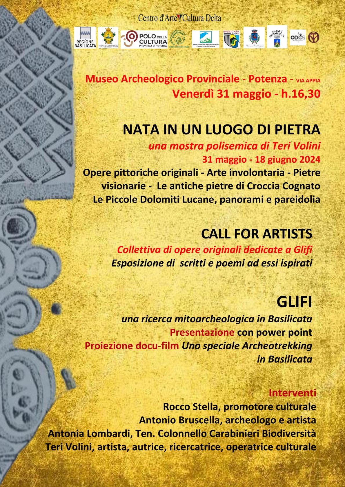 Presso il Museo Archeologico provinciale Lacava di potenza si terrà, venerdì 31 maggio, il vernissage di un’articolata mostra di Teri Volini, NATA IN UN LUOGO DI PIETRA, con riferimento non solo alla provenienza dell’Artista, originaria delle Piccole Dolomiti Lucane, ma all’influsso che queste hanno avuto sul suo percorso artistico… È quest’ultimo infatti il tema dominante dell’originale esposizione, che prevede al suo interno altri due eventi: da un lato, la presentazione del saggio Glifi, una ricerca mitoarcheologica in Basilicata – frutto di un impegno ultraventennale dell’Autrice, che l’ha portata a decifrare i simboli archetipi incisi sulle Pietre Ancestrali dell’Acropolis di Croccia, sito archeologico del Parco Gallipoli Cognato – e in contemporanea la mostra collettiva Call for Artists, i cui partecipanti hanno creato delle opere visive o degli scritti, ispirati e dedicati al saggio…