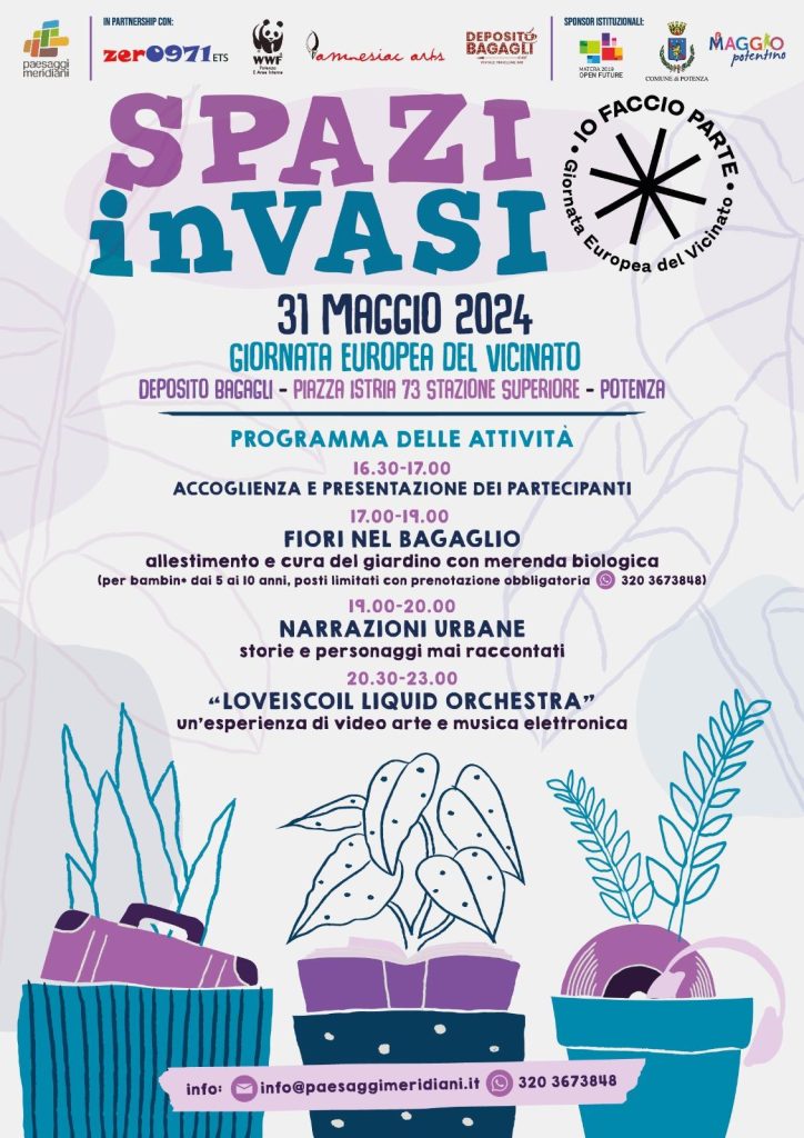 28.05.2024 – ore 16,25: Spazi InVasi è l’evento che l’associazione Zer0971 ha ideato ed organizzato nell’ambito dei festeggiamenti del Maggio Potentino del Comune di Potenza, e fatto coincidere per la Giornata Europea del Vicinato (European neighbors’day), una ricorrenza annuale dedicata a celebrare le comunità, i vicinati, le relazioni interpersonali, la partecipazione civica, e i valori di solidarietà e vicinanza.