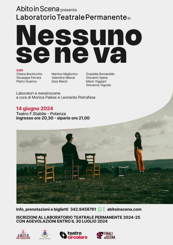 Il lavoro pone al centro della sua elaborazione i concetti di relazione, socialità, partecipazione attiva all’interno delle dinamiche teatrali. Il 14 giugno si terrà a Potenza alle ore 21, nel Teatro F. Stabile, patrocinato dal Comune di Potenza, lo spettacolo ‘Nessuno se ne va’, frutto del lavoro dell’anno formativo in corso e che racconta la vita di una compagnia teatrale e con lei quella dell’attore, la crisi, i suoi dubbi, le sue conquiste fino all’allestimento dello spettacolo, che sembra quasi essere una luce che illumina il sentiero, il cammino degli attori stessi.