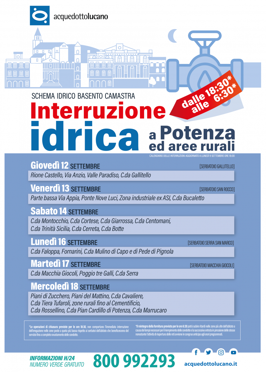 Mercoledì 18 Settembre: Piani di Zucchero, Piani del Mattino, C.da Cavaliere, C.da Tiera Tufaroli, zone rurali fino al Cementificio, C.da Rossellino, C.da Pian Cardillo di Potenza, C.da Marrucaro.