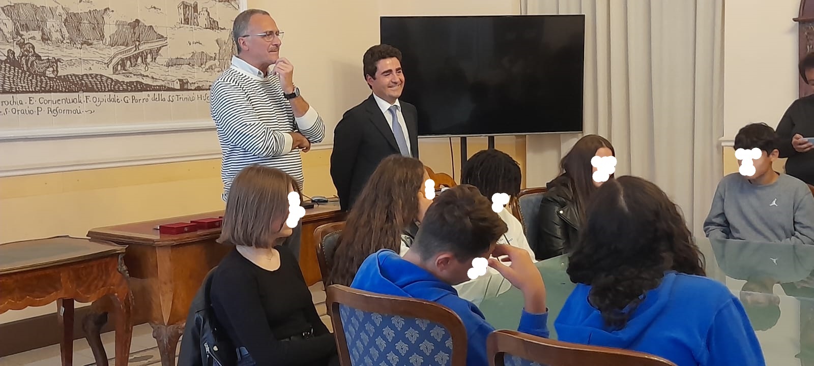 A incontrare il presidente del Consiglio comunale Smaldone, Antonello Faretta, responsabile scientifico del ‘Palio Cinematografico Studentesco’ e Adriana Bruno, responsabile scientifico di ‘La Scuola Gira’. Con loro una delegazione delle tre scuole di Potenza che hanno partecipato all’evento ‘Ad Occhi Aperti’. Ad accompagnare gli studenti dell’Istituto ‘Da Vinci-Nitti’ la docente Mariateresa Lovallo. Con quelli dell’Istituto ‘Milani’ la già dirigente Marcella Marsico e la docente Paola Benevento. Per l’Istituto ‘Giorgi’ ragazzi presenti insieme alle docenti Angela Natrone, Giulia Pietrafesa, Francesca D’Angelo, Tiziana Cione e Giustina Sessa.
