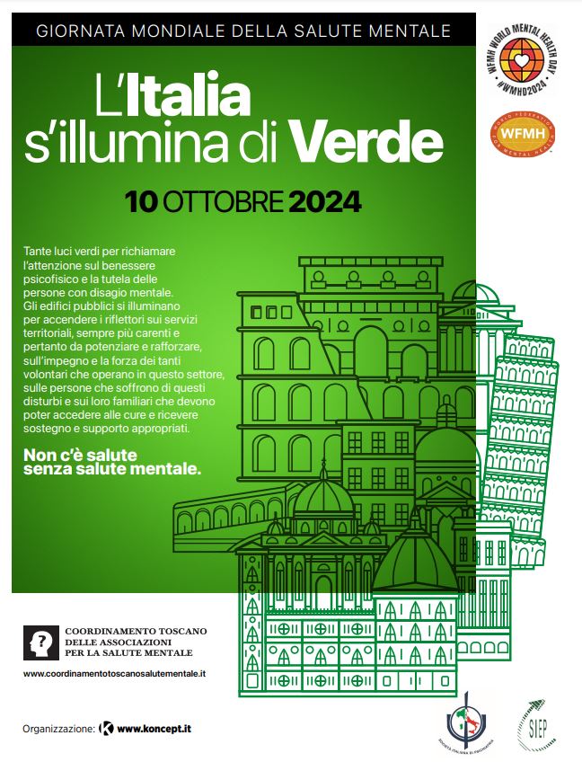 9.10.2024 – ore 11,25: In occasione della Giornata Mondiale della Salute Mentale, in programma il 10 ottobre 2024, il Palazzo di Città, sede municipale di piazza Matteotti, nel centro storico del capoluogo lucano, sarà illuminato di verde quale segno di condivisione del Comune di Potenza dell’iniziativa promossa dal Coordinamento Toscano delle Associazioni per la Salute Mentale, che ha l’adesione di 53 associazioni di familiari e utenti. Lo scopo principale è quello di tutelare i diritti delle persone con disturbi mentali e delle loro famiglie, sensibilizzando la popolazione sulle problematiche che attengono al disagio mentale, condizione in continuo aumento in tutte le fasce della popolazione, e di favorire la promozione del benessere psicofisico, bene prezioso per tutti.
