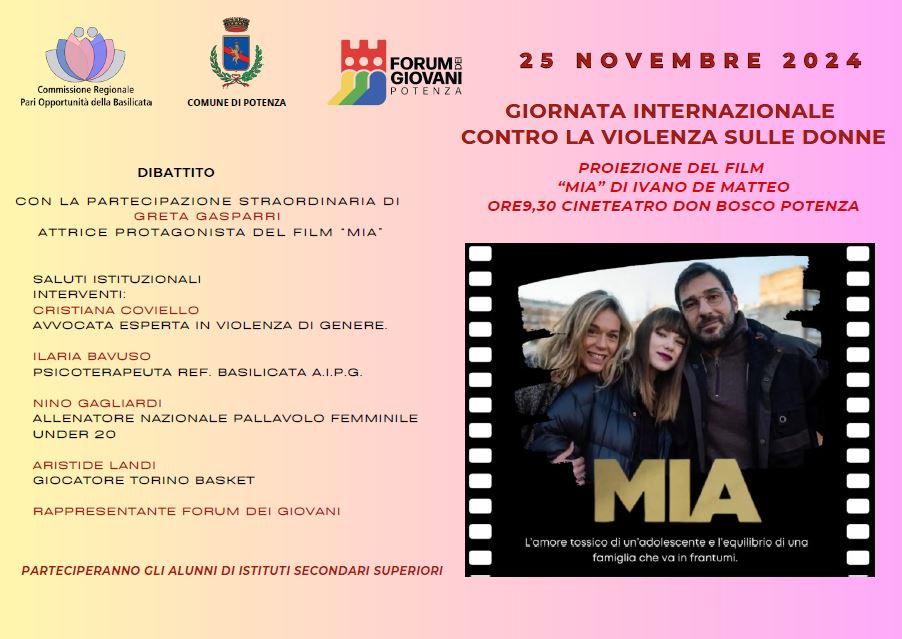 L’appuntamento è fissato per il 25 novembre 2024, alle ore 9,30, nel Cineteatro Don Bosco di Potenza, dove sarà proiettato il film ‘MIA’ di Ivano De Matteo.