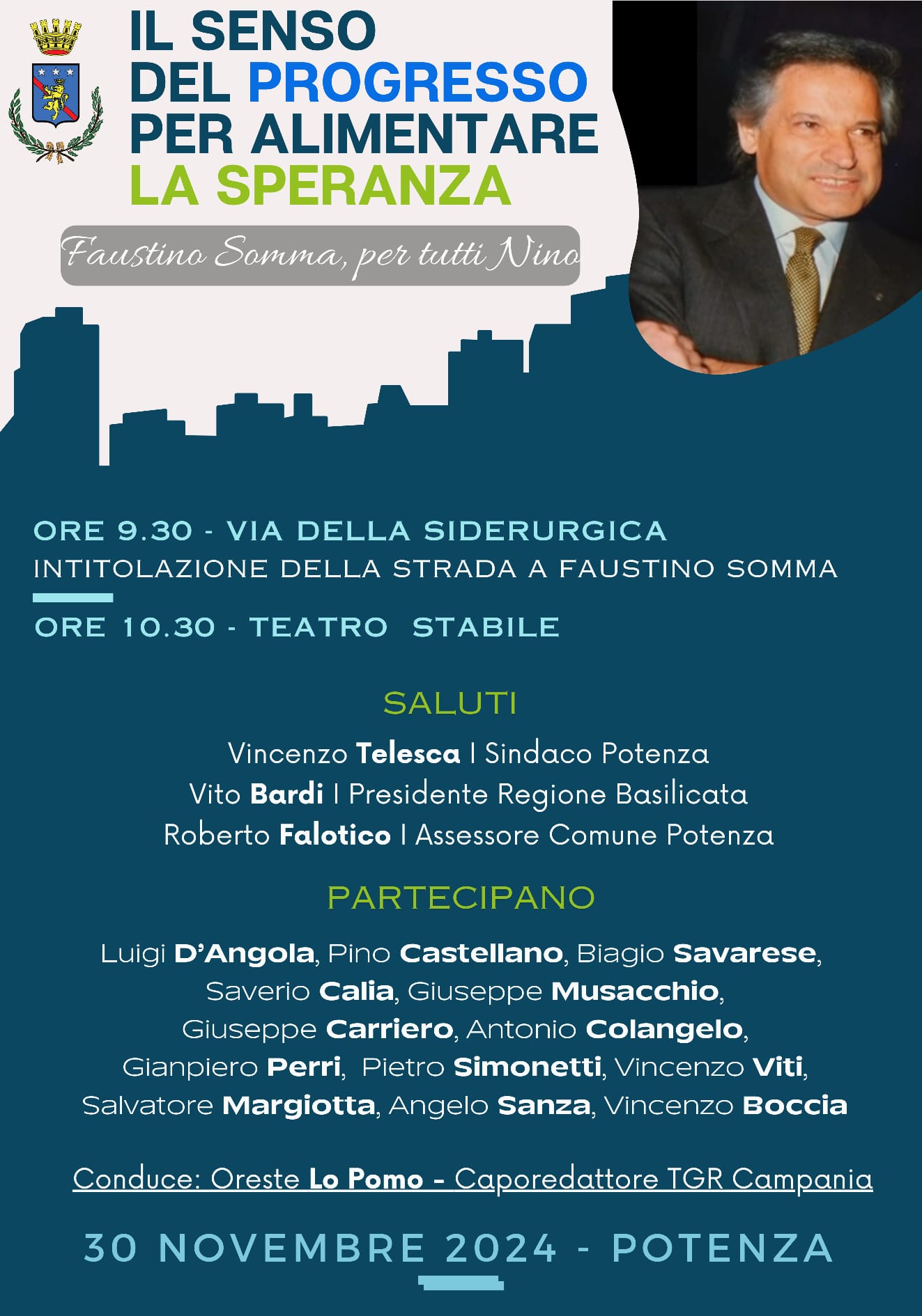 28.11.2024 – ore 10,40: La Città di Potenza intitola a Faustino Somma la parte di via della Siderurgica che dall’intersezione con via dell’Elettronica giunge fino allo stabilimento Siderpotenza del Gruppo Pittini. La cerimonia è in programma sabato 30 novembre 2024 alle ore 9,30, in corrispondenza dell’incrocio tra via della Siderurgica e via dell’Elettronica. A seguire, nel teatro Stabile, in piazza Mario Pagano alle 10,30, l’incontro ‘Il senso del progresso per alimentare la speranza Faustino Somma, per tutti Nino’. Prevista la partecipazione di Luigi D’Angola, Pino Castellano, Biagio Savarese, Saverio Calia, Giuseppe Musacchio, Giuseppe Carriero, Antonio Colangelo, Gianpiero Perri, Pietro Simonetti, Vincenzo Viti, Salvatore Margiotta, Angelo sanza, Vincenzo Boccia e di Oreste Lopomo che modererà gli interventi. I saluti istituzionali affidati al Sindaco di Potenza Vincenzo Telesca, al presidente della Regione Basilicata Vito Bardi e all’assessore alla Cultura del Comune di Potenza Roberto Falotico. “Con questa iniziativa diamo seguito alla delibera di Giunta comunale numero 35 del 2 febbraio di quest’anno, – spiega l’assessore Falotico – atto che ho proposto alla Giunta ritenendo che la figura di Nino Somma, rappresentasse un capitolo decisivo nella storia del capoluogo di regione. Imprenditore, dirigente sportivo, politico, ma soprattutto una grande persona che ha saputo dare lustro a questo territorio e ai suoi abitanti. L’intitolazione della strada rientra in un programma che guarda con attenzione alla valorizzazione della memoria, attività che stiamo per realizzare attraverso l’apposizione di tutte le targhe che indicano i luoghi del centro storico. Una revisione complessiva della toponomastica resta imprescindibile per conservare la memoria, perché senza memoria non c’è prospettiva. A 10 anni dalla sua scomparsa, la figura di Nino è ancora viva in tutti noi: – continua Falotico – industria, Istituzioni, mondo finanziario, quello del calcio, in tutti i ruoli Somma ha evidenziato capacità e abnegazione non comuni. Precursore, costruttore di futuro, sapeva guardare lontano, oltre, rendendo concrete esperienze e percorsi che ancora oggi producono i propri effetti positivi. L’Industria Siderurgica Lucana, oggi Siderpotenza, 60 anni dopo la creazione della quale è stato artefice, si conferma azienda leader nel settore, è sintesi delle sue indubbie capacità, così come lo sono le altre esperienze, nelle quali ha saputo offrire le sue migliori energie, riservando un posto di primo piano al bene della comunità nella quale ha vissuto. La famiglia Somma, nel campo dell’industria, continua a essere punto di riferimento per Potenza e per l’intera Basilicata, operando concretamente per contrastare le difficoltà che vive il settore e proponendo soluzioni innovative. Spiccate doti manageriali, attento agli aspetti occupazionali, anche nel settore economico e finanziario, Nino Somma ha saputo far valere la propria competenza, legando la sua figura a nomi e vicende che hanno fatto la storia delle banche della nostra regione: Banca Popolare Cooperativa di Pescopagano, Banca di Lucania, Banca Mediterranea. Lavoratori, imprenditori, risparmiatori, per generazioni hanno visto in quegli istituti di credito un riferimento. Società di leasing, di factoring, informatica, assicurazioni, servizi aziendali, immobiliari sono alcuni dei settori nei quali, negli anni, Faustino Somma ha trasformato le idee in atti concreti, volti anche al bene di migliaia di persone e di famiglie che, grazie a lui, hanno trovato la stabilità di un lavoro. Da amministratore comprendo quanta dedizione occorra per servire la propria comunità, e il suo aver ricoperto anche questo ruolo, nella cittadina di Vaglio, ne attesta una volta di più il suo spessore di uomo a 360 gradi. In ultimo, non per importanza, la sua esperienza alla presidenza della squadra di calcio del Potenza, con lui promosso in serie C, contribuisce a definirne la figura, poliedrica, versatile, ricca di talenti e di talento. Vorremmo che emerga, oltre alle sue capacità, l’aspetto umano, quella caratteristica sua propria di conferire umanità a tutto ciò che faceva, a ciò che era. Insieme alle virtù, vorrei che restasse indelebile nella memoria della comunità, appunto l’umanità che aveva con tutti, dalle persone più importanti a quelle più umili”.