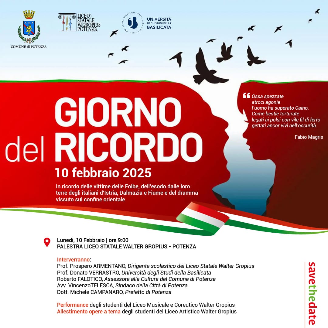 7.02.2025 – ore 9,15: In occasione del ‘Giorno del Ricordo’ che si celebrerà il 10 febbraio 2025, Comune di Potenza, Liceo statale ‘Walter Gropius’ e Università degli Studi di Basilicata, hanno organizzato un incontro che si terrà alle ore 9, nella Palestra del liceo. Saranno presenti il Prefetto di Potenza Michele Campanaro, il Sindaco di Potenza Vincenzo Telesca, l’assessore alla Cultura Roberto Falotico, il professor Donato Verrastro dell’Università di Basilicata e il dirigente scolastico del liceo che ospita la manifestazione, Prospero Armentano.